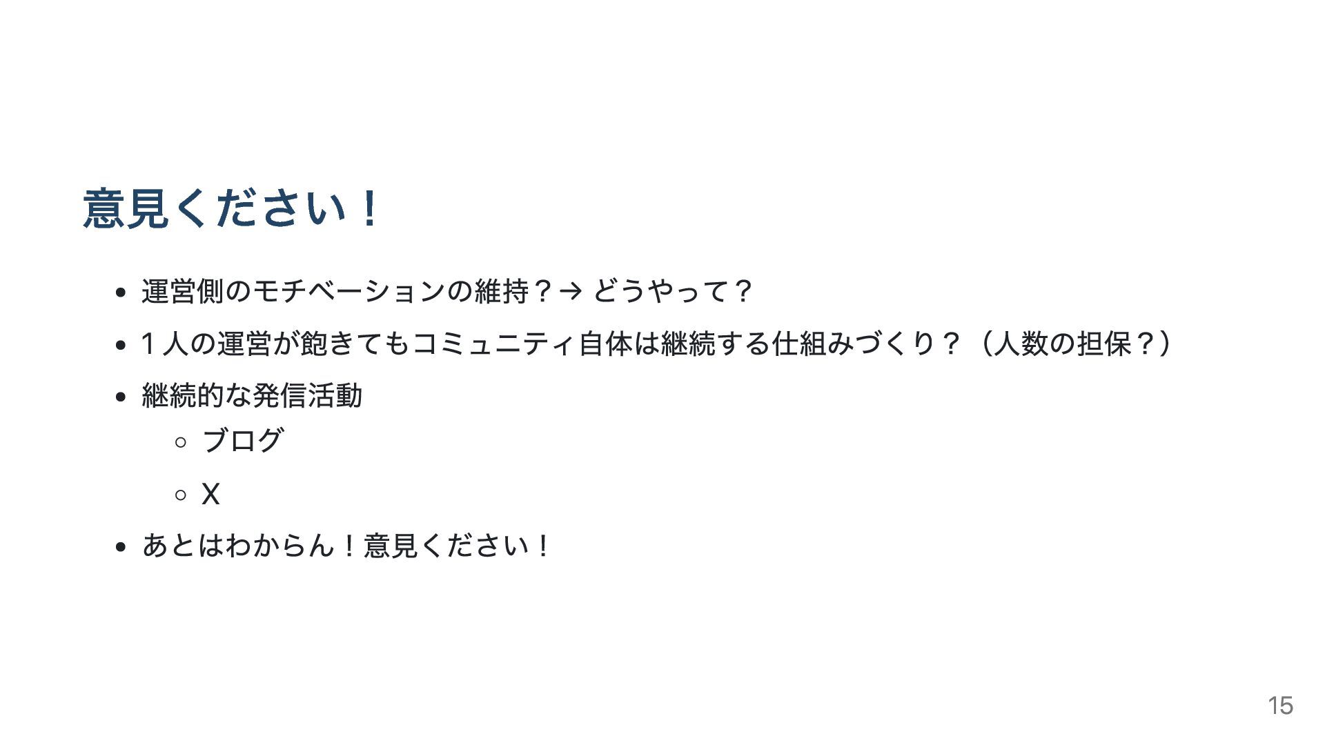 意見ください! 運営側のモチベーションの維持?→ どうやって? 1 人の運営が飽きてもコミュニティ自体は継続する仕組みづくり?(人数の担保?) 継続的な発信活動 ブログ X あとはわからん!意見ください! 15
