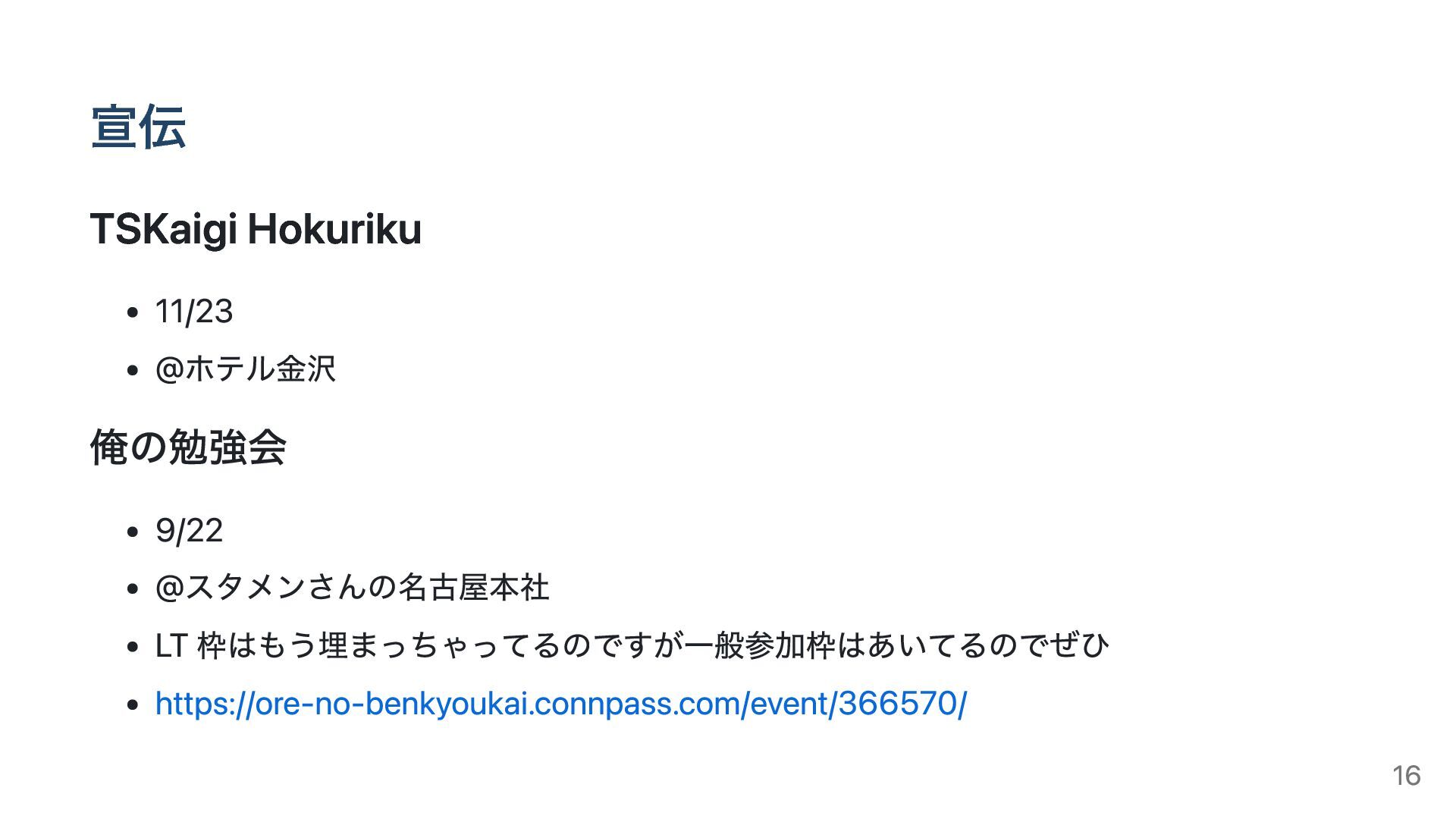 宣伝 TSKaigi Hokuriku 11/23 @ホテル金沢 俺の勉強会 9/22 @スタメンさんの名古屋本社 LT 枠はもう埋まっちゃってるのですが一般参加枠はあいてるのでぜひ