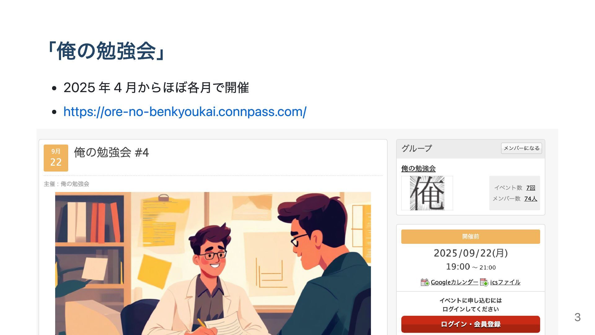 「俺の勉強会」 2025 年 4 月からほぼ各月で開催 https://ore-no-benkyoukai.connpass.com/ 3