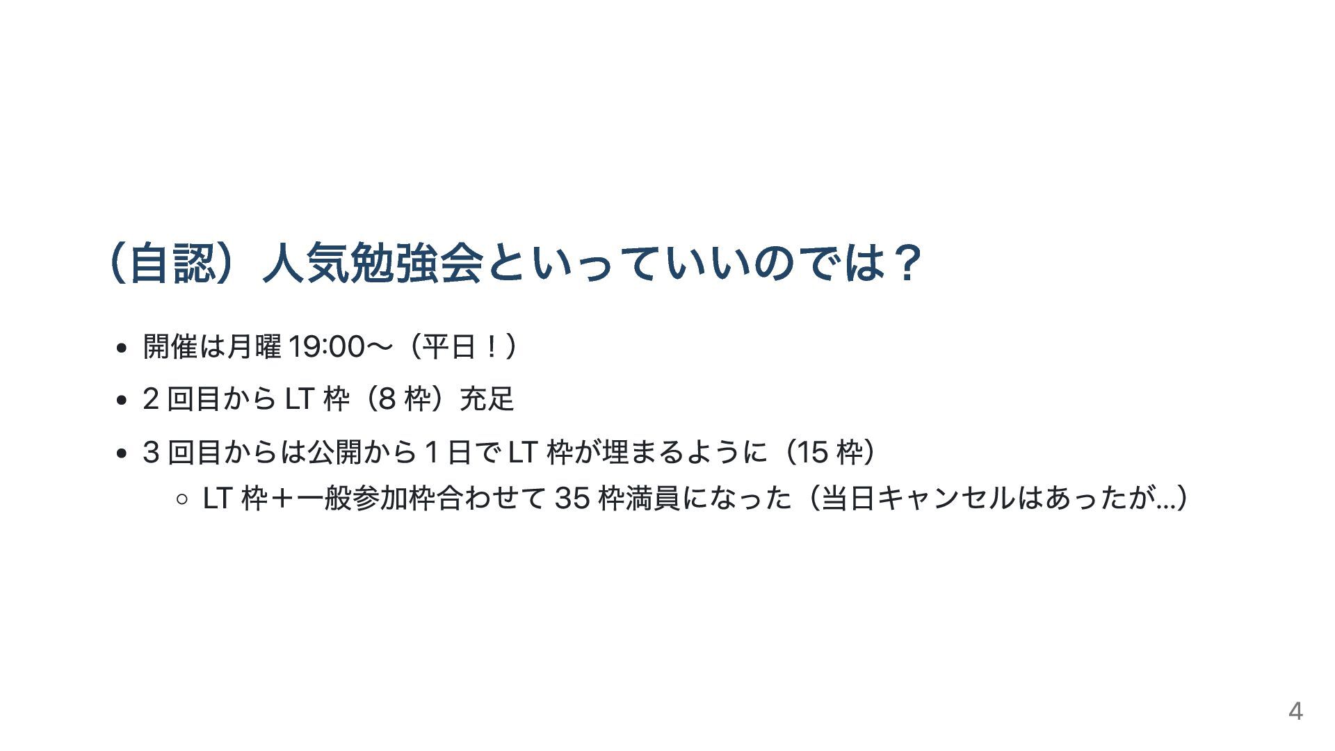 (自認)人気勉強会といっていいのでは? 開催は月曜 19:00〜(平日!) 2 回目から LT 枠(8 枠)充足 3 回目からは公開から