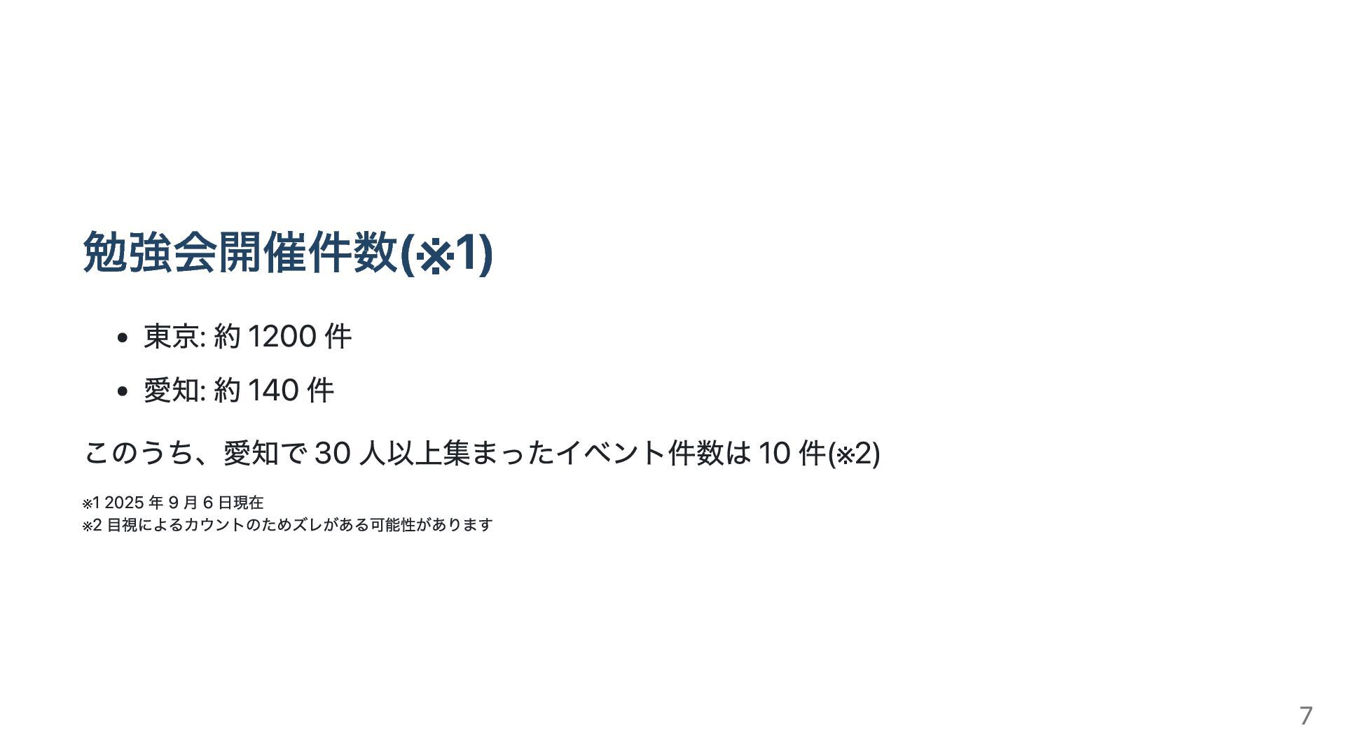 このうち、愛知で 30 人以上集まったイベント件数は 10 件(※ 2) ※ 1 2025 年 9 月 6 日現在 ※ 2 目視によるカウントのためズレがある可能性があります 7