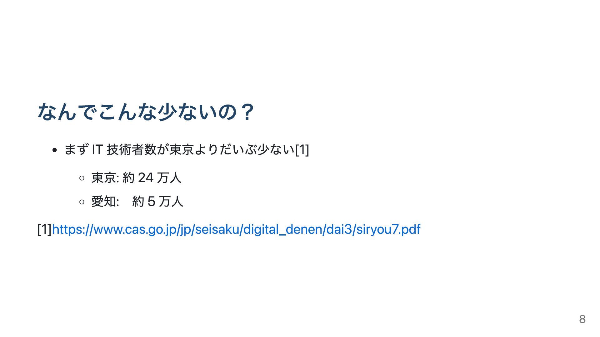 なんでこんな少ないの? まず IT 技術者数が東京よりだいぶ少ない[1] 東京: 約 24 万人 愛知: 約 5