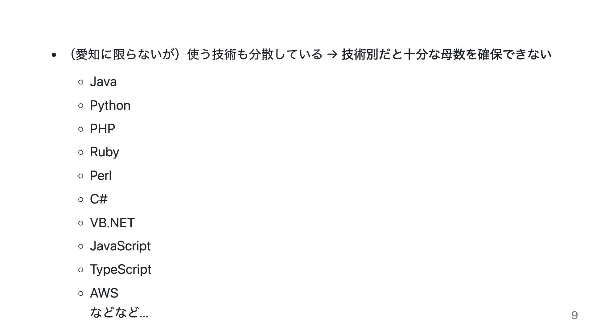 (愛知に限らないが)使う技術も分散している → 技術別だと十分な母数を確保できない Java Python PHP Ruby Perl C# VB.NET