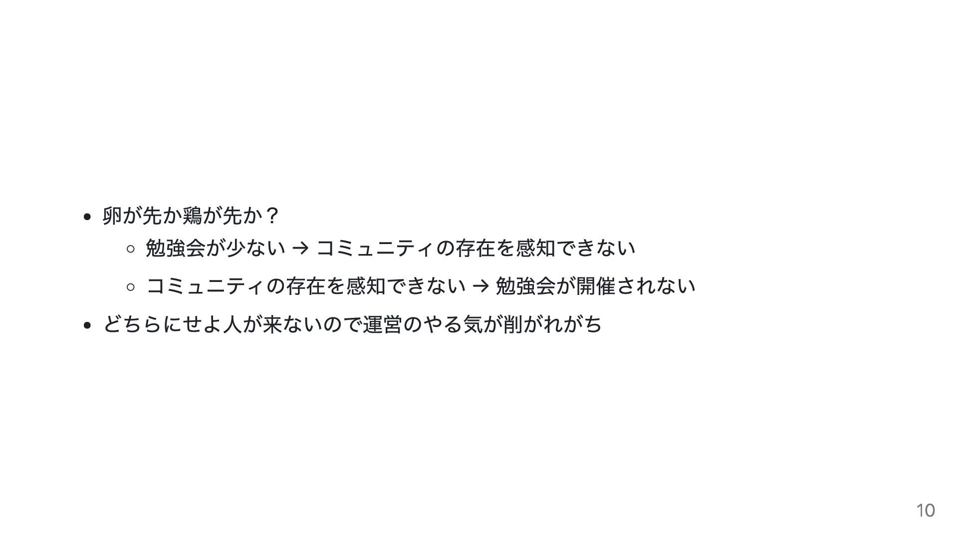 卵が先か鶏が先か? 勉強会が少ない → コミュニティの存在を感知できない コミュニティの存在を感知できない → 勉強会が開催されない どちらにせよ人が来ないので運営のやる気が削がれがち 10