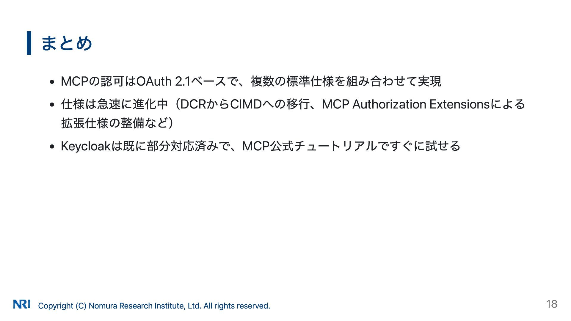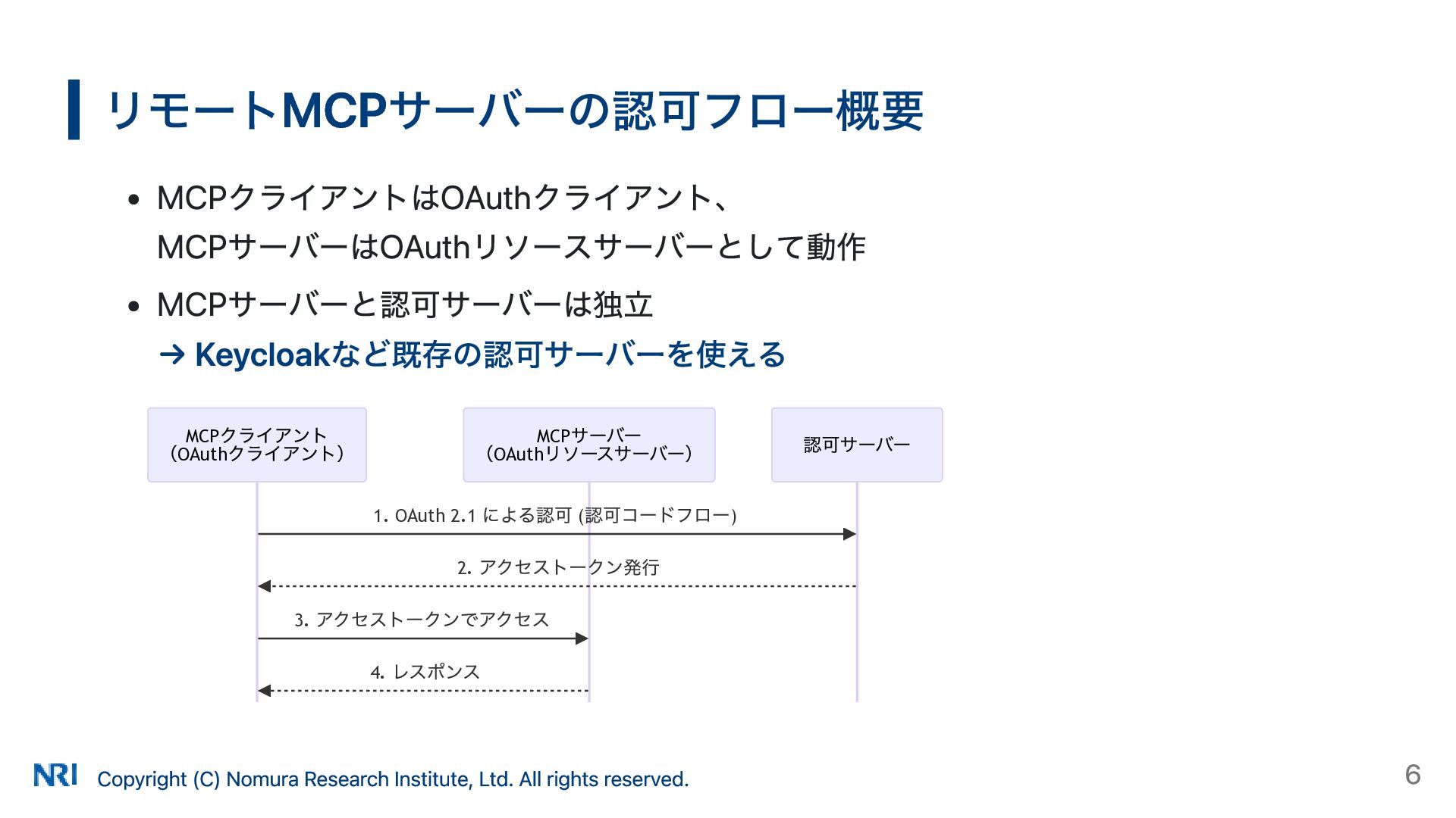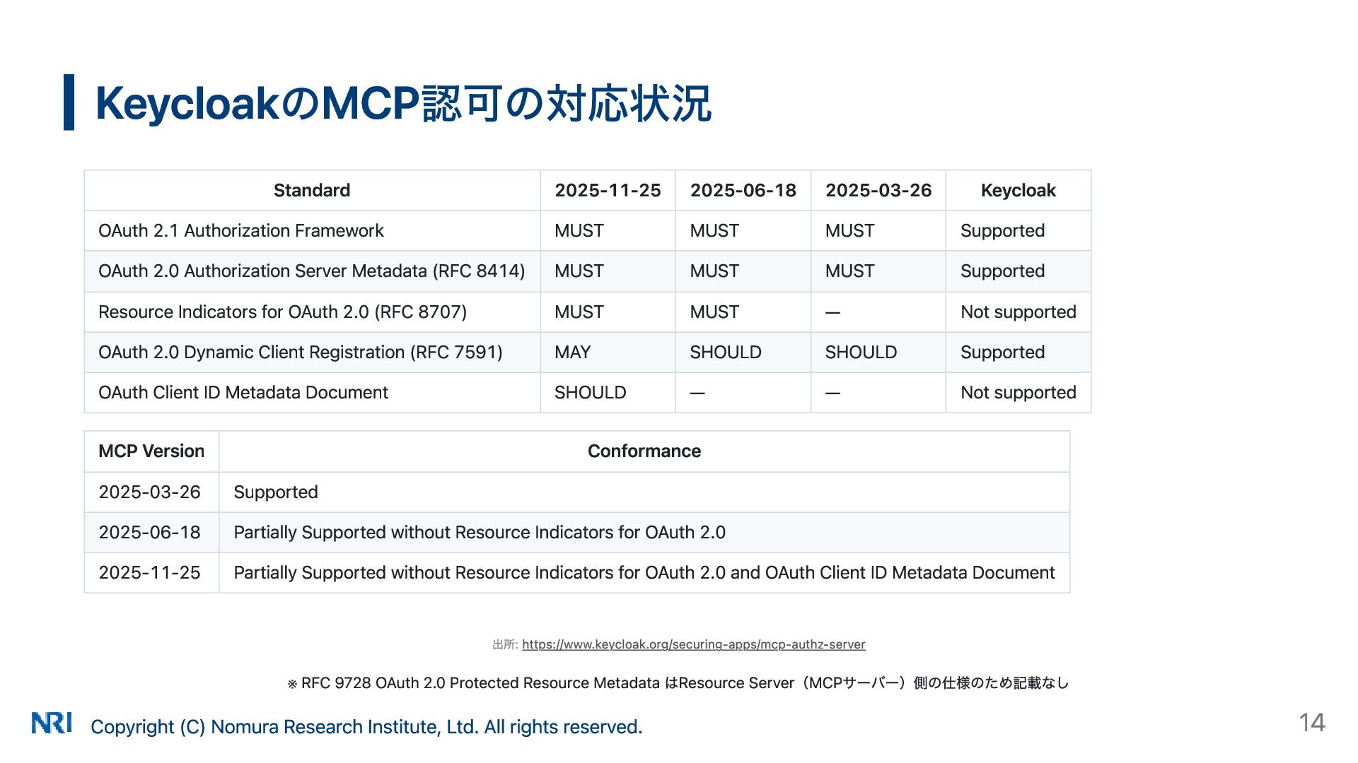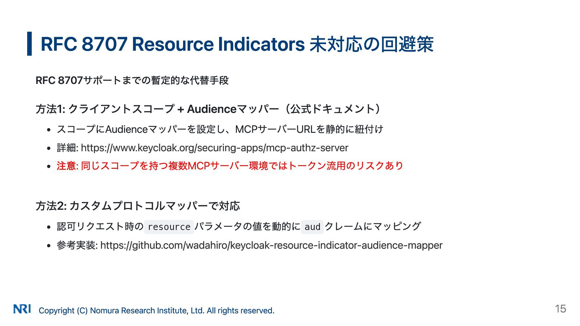 MUST MUST Supported OAuth 2.0 Authorization Server Metadata (RFC 8414) MUST MUST MUST Supported Resource Indicators for OAuth 2.0 (RFC 8707) MUST MUST — Not supported OAuth 2.0 Dynamic Client Registration (RFC 7591) MAY SHOULD SHOULD Supported OAuth Client ID Metadata Document SHOULD — — Not supported MCP Version Conformance 2025-03-26 Supported 2025-06-18 Partially Supported without Resource Indicators for OAuth 2.0 2025-11-25 Partially Supported without Resource Indicators for OAuth 2.0 and OAuth Client ID Metadata Document KeycloakのMCP認可の対応状況 出所: https://www.keycloak.org/securing-apps/mcp-authz-server ※ RFC 9728 OAuth 2.0 Protected Resource Metadata はResource Server(MCPサーバー)側の仕様のため記載なし Copyright (C) Nomura Research Institute, Ltd. All rights reserved. 14