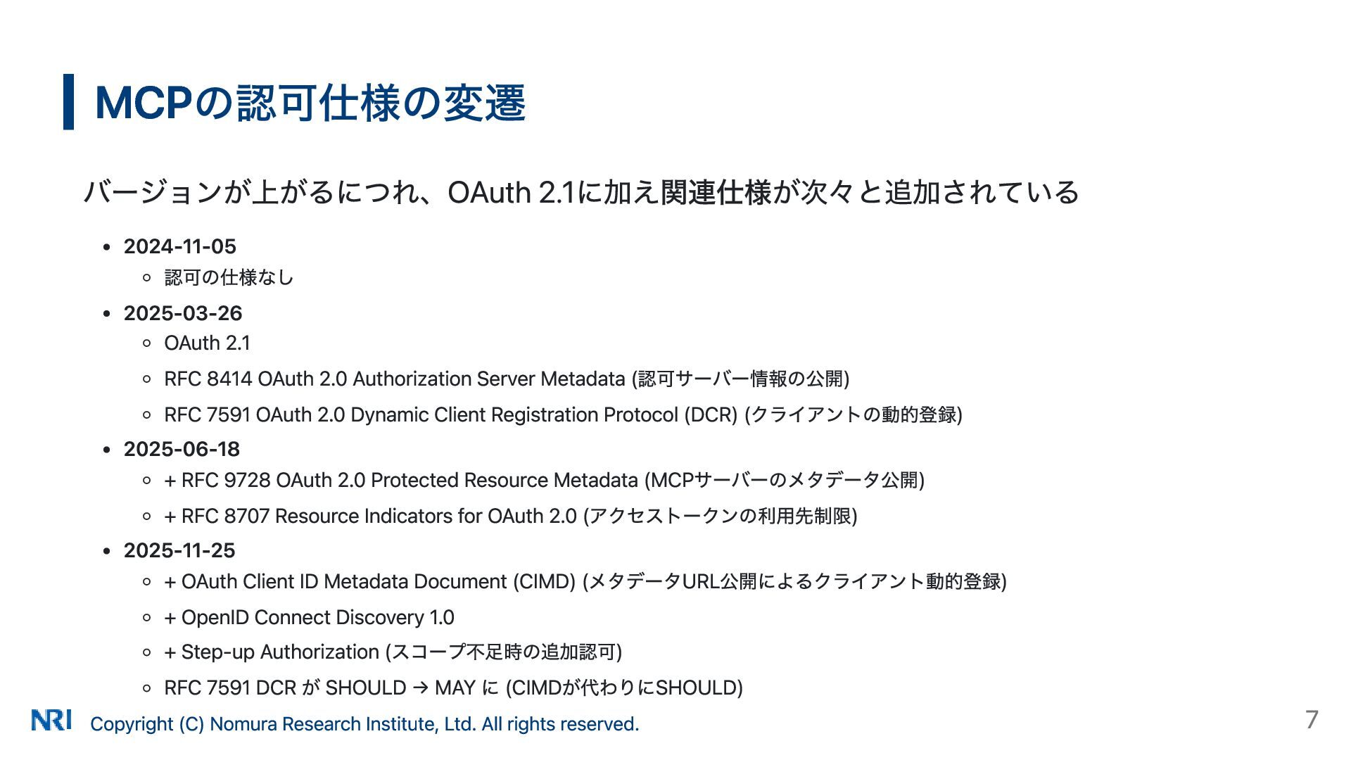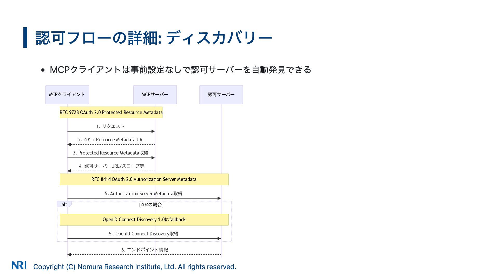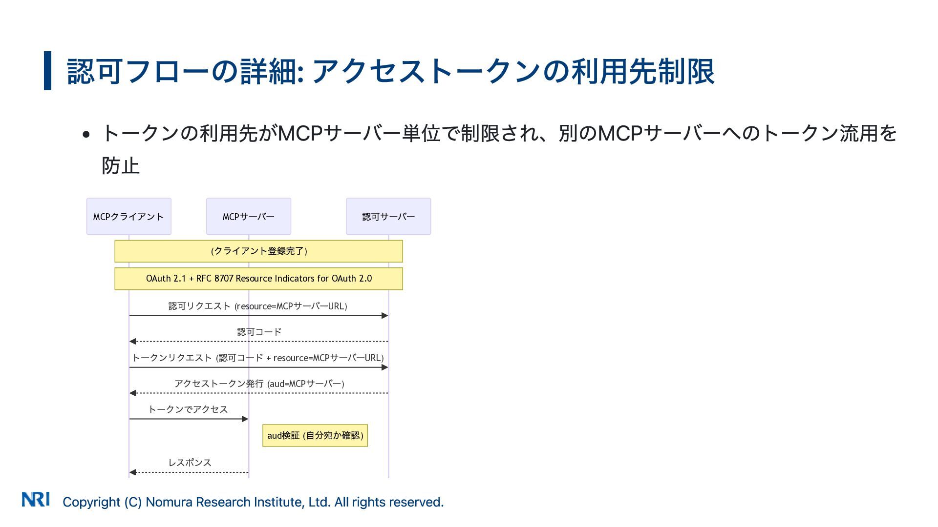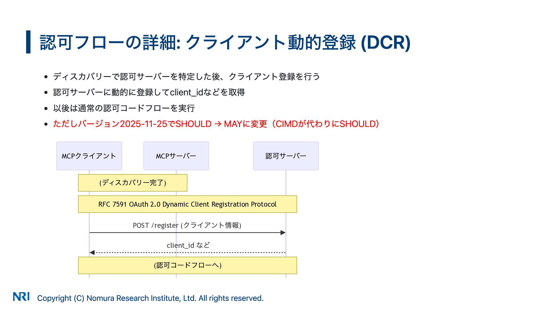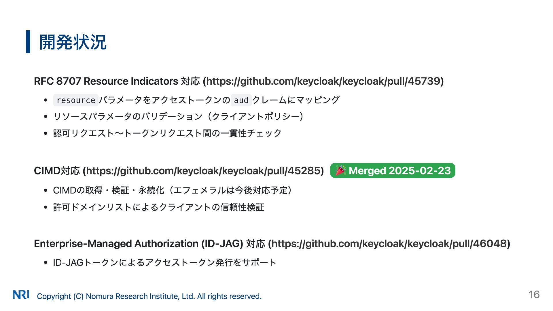 MUST MUST Supported OAuth 2.0 Authorization Server Metadata (RFC 8414) MUST MUST MUST Supported Resource Indicators for OAuth 2.0 (RFC 8707) MUST MUST — Not supported OAuth 2.0 Dynamic Client Registration (RFC 7591) MAY SHOULD SHOULD Supported OAuth Client ID Metadata Document SHOULD — — Not supported MCP Version Conformance 2025-03-26 Supported 2025-06-18 Partially Supported without Resource Indicators for OAuth 2.0 2025-11-25 Partially Supported without Resource Indicators for OAuth 2.0 and OAuth Client ID Metadata Document KeycloakのMCP認可の対応状況 出所: https://www.keycloak.org/securing-apps/mcp-authz-server ※ RFC 9728 OAuth 2.0 Protected Resource Metadata はResource Server(MCPサーバー)側の仕様のため記載なし Copyright (C) Nomura Research Institute, Ltd. All rights reserved. 14