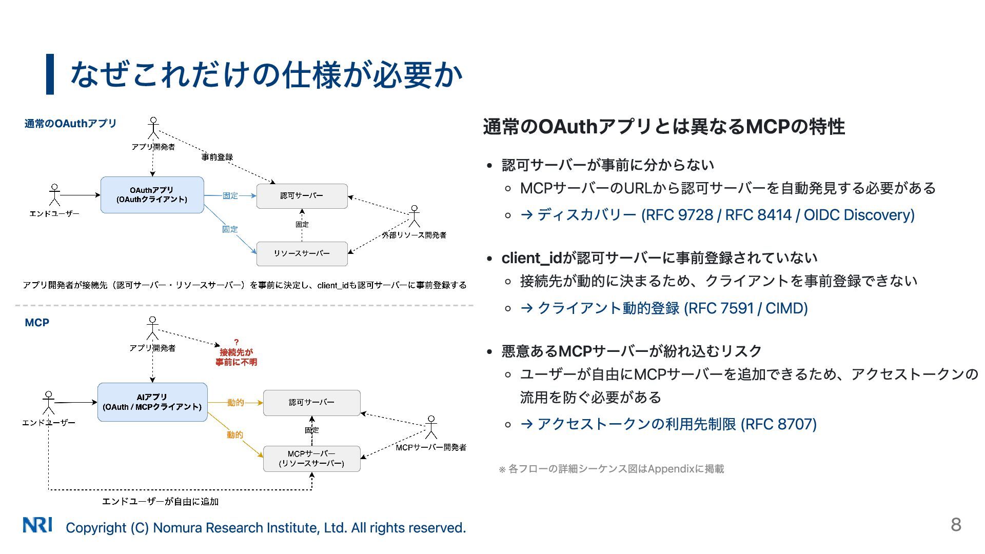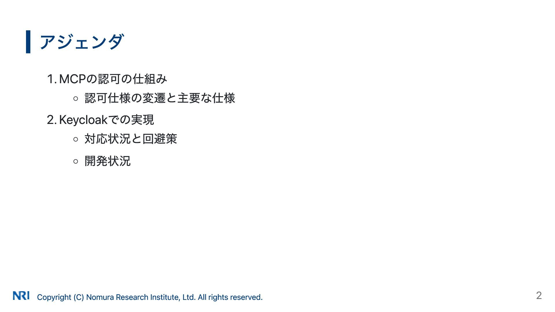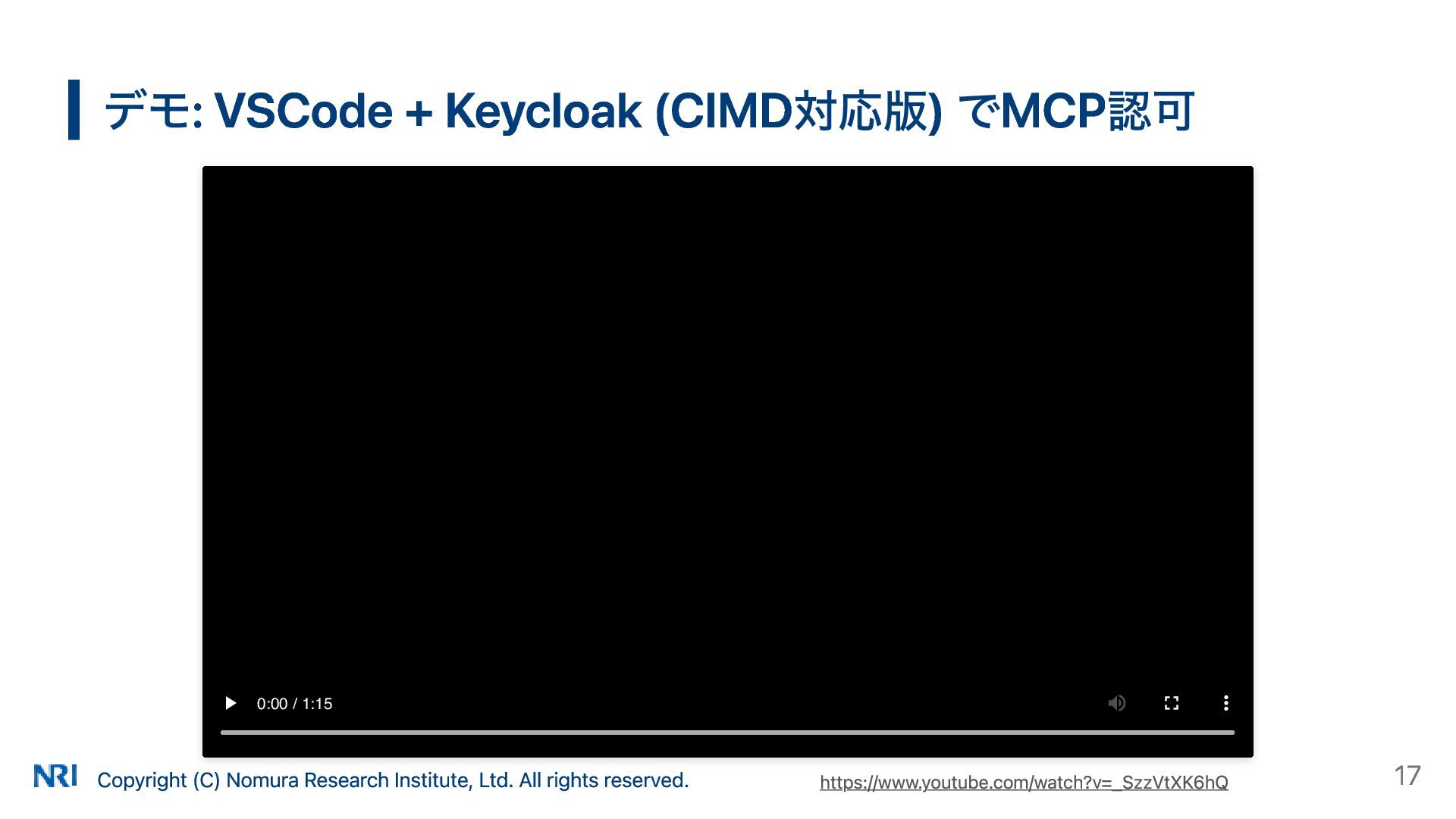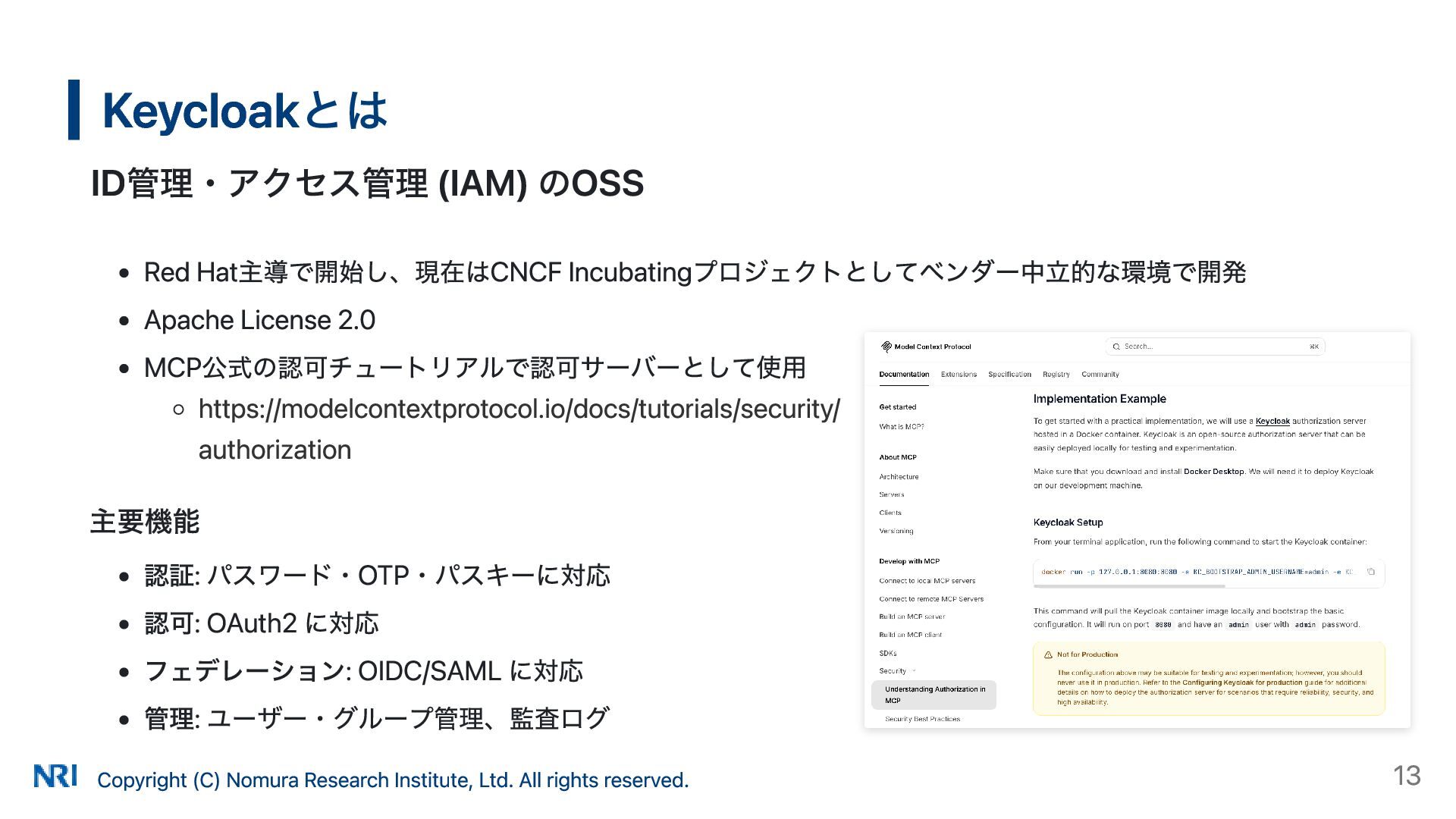 MUST MUST Supported OAuth 2.0 Authorization Server Metadata (RFC 8414) MUST MUST MUST Supported Resource Indicators for OAuth 2.0 (RFC 8707) MUST MUST — Not supported OAuth 2.0 Dynamic Client Registration (RFC 7591) MAY SHOULD SHOULD Supported OAuth Client ID Metadata Document SHOULD — — Not supported MCP Version Conformance 2025-03-26 Supported 2025-06-18 Partially Supported without Resource Indicators for OAuth 2.0 2025-11-25 Partially Supported without Resource Indicators for OAuth 2.0 and OAuth Client ID Metadata Document KeycloakのMCP認可の対応状況 出所: https://www.keycloak.org/securing-apps/mcp-authz-server ※ RFC 9728 OAuth 2.0 Protected Resource Metadata はResource Server(MCPサーバー)側の仕様のため記載なし Copyright (C) Nomura Research Institute, Ltd. All rights reserved. 14