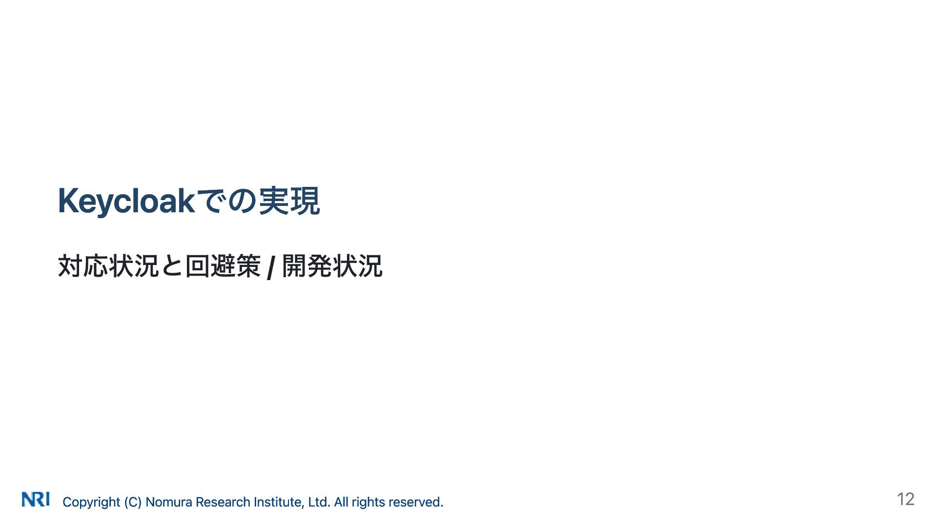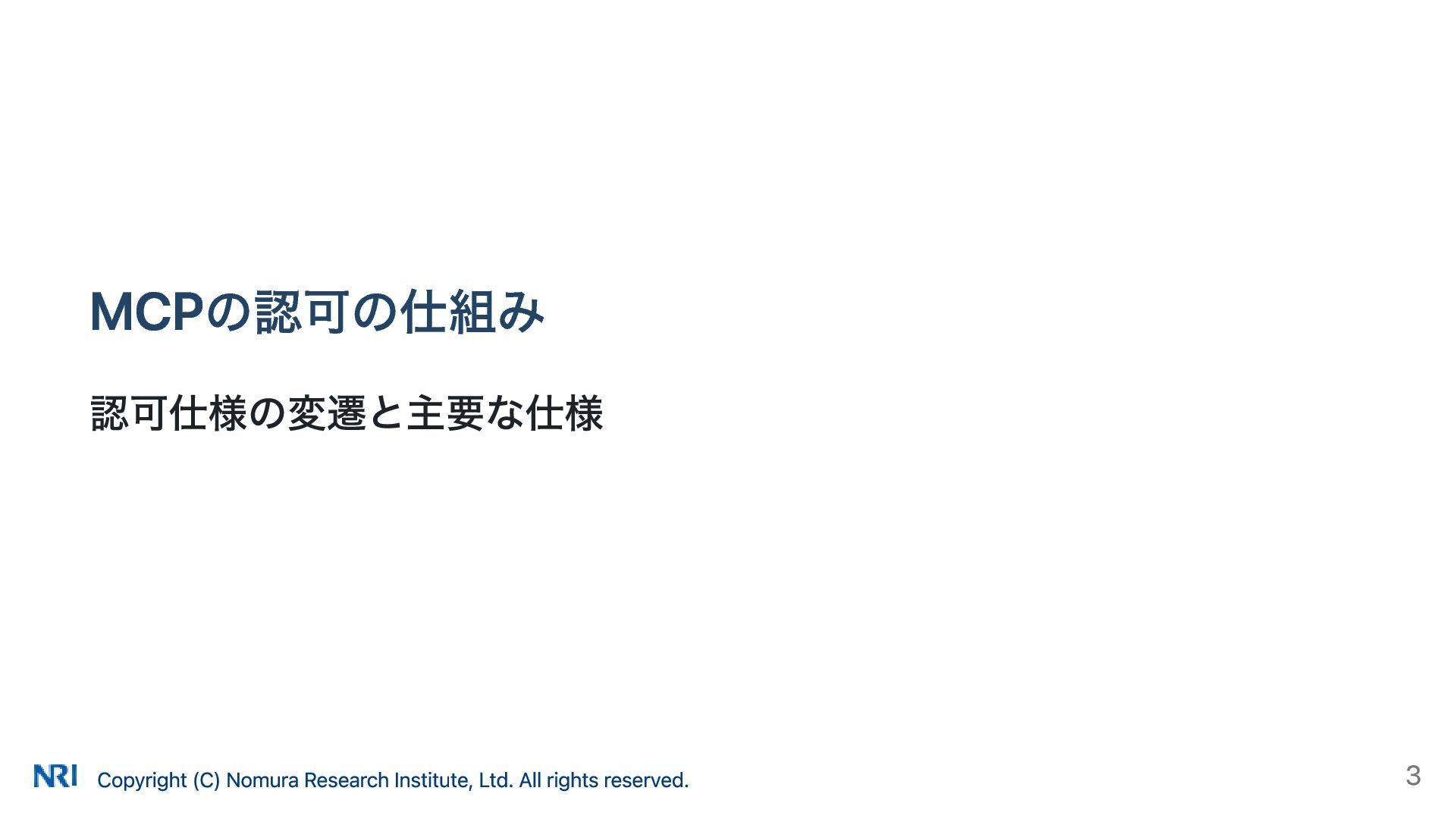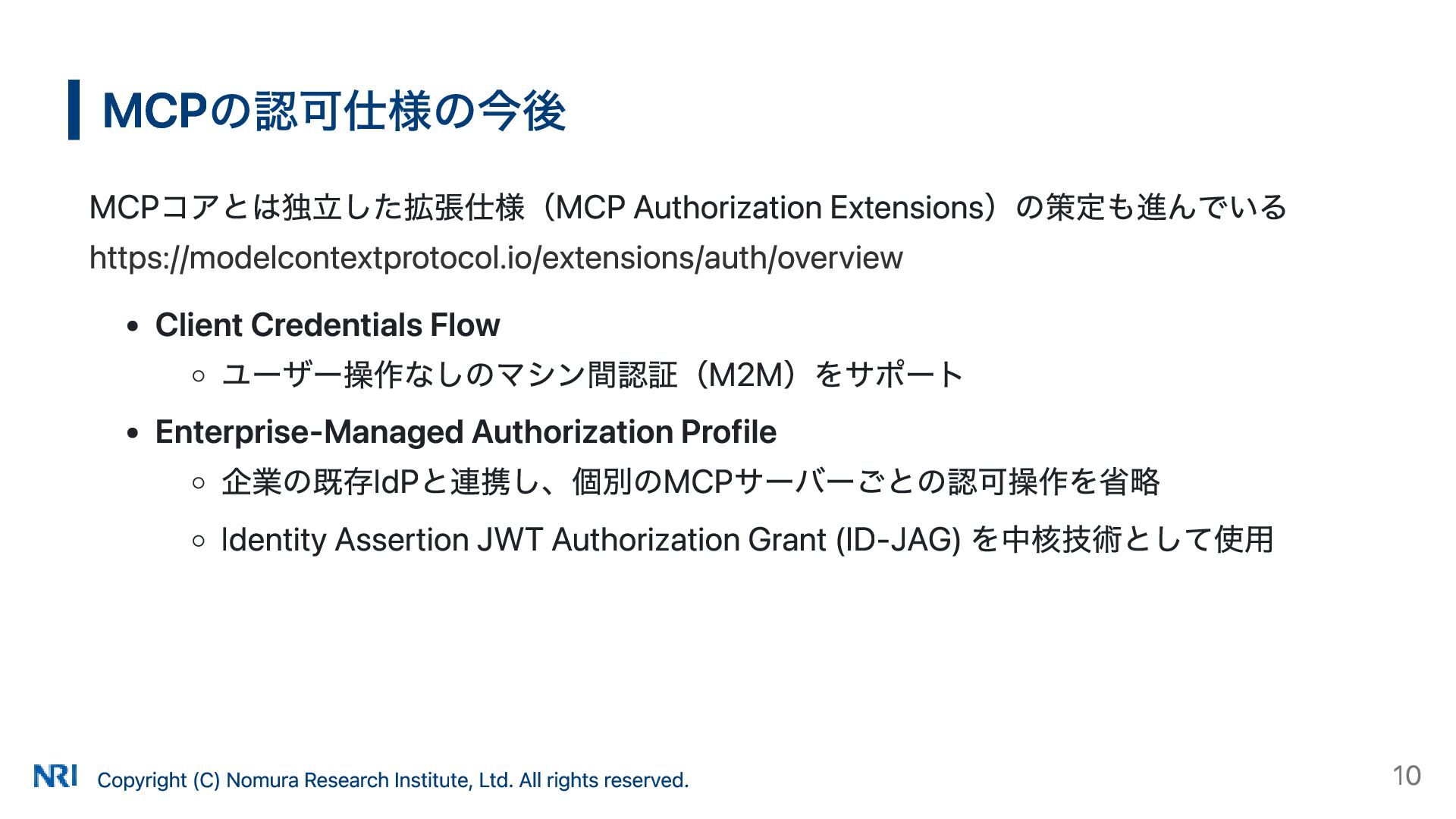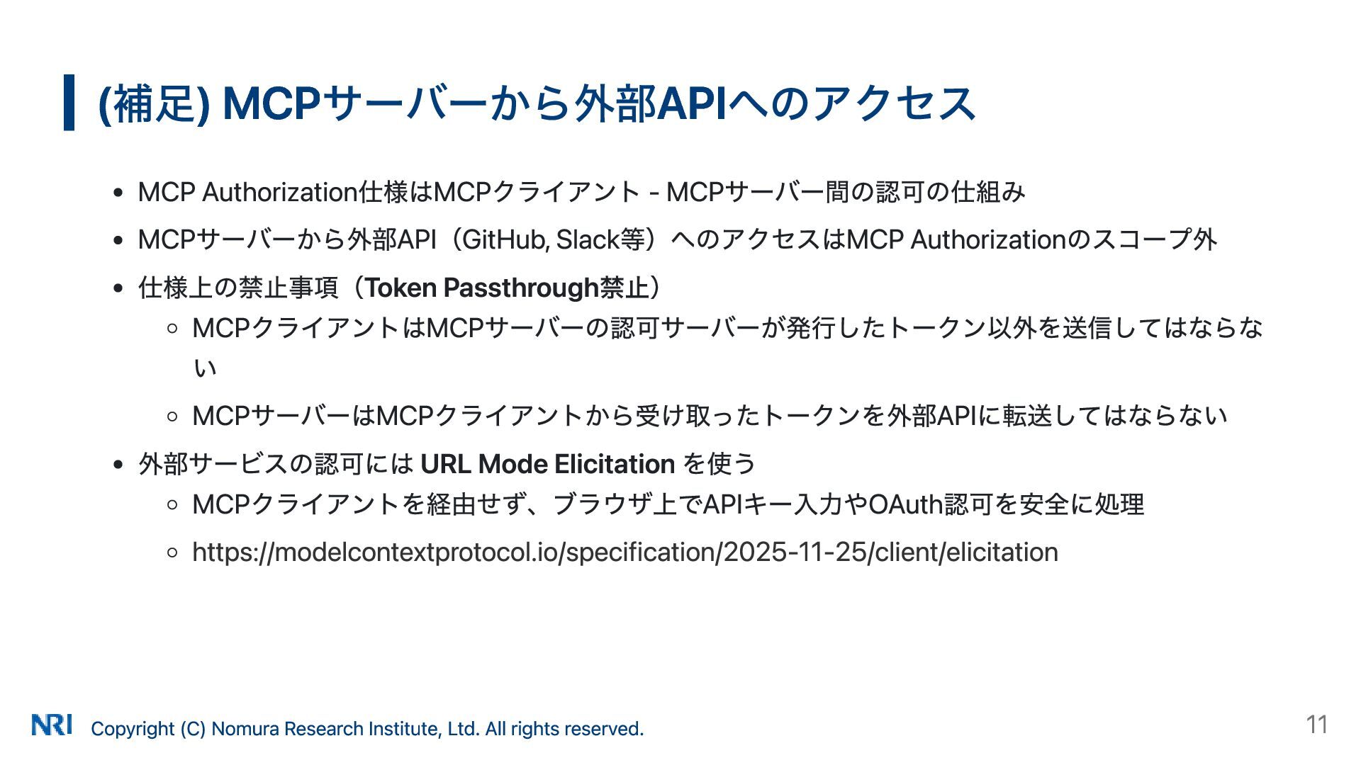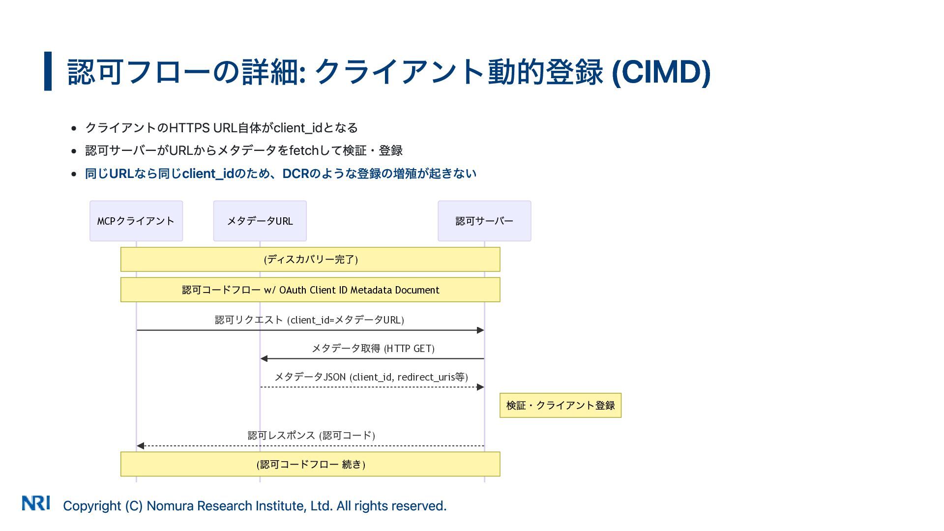 MUST MUST Supported OAuth 2.0 Authorization Server Metadata (RFC 8414) MUST MUST MUST Supported Resource Indicators for OAuth 2.0 (RFC 8707) MUST MUST — Not supported OAuth 2.0 Dynamic Client Registration (RFC 7591) MAY SHOULD SHOULD Supported OAuth Client ID Metadata Document SHOULD — — Not supported MCP Version Conformance 2025-03-26 Supported 2025-06-18 Partially Supported without Resource Indicators for OAuth 2.0 2025-11-25 Partially Supported without Resource Indicators for OAuth 2.0 and OAuth Client ID Metadata Document KeycloakのMCP認可の対応状況 出所: https://www.keycloak.org/securing-apps/mcp-authz-server ※ RFC 9728 OAuth 2.0 Protected Resource Metadata はResource Server(MCPサーバー)側の仕様のため記載なし Copyright (C) Nomura Research Institute, Ltd. All rights reserved. 14