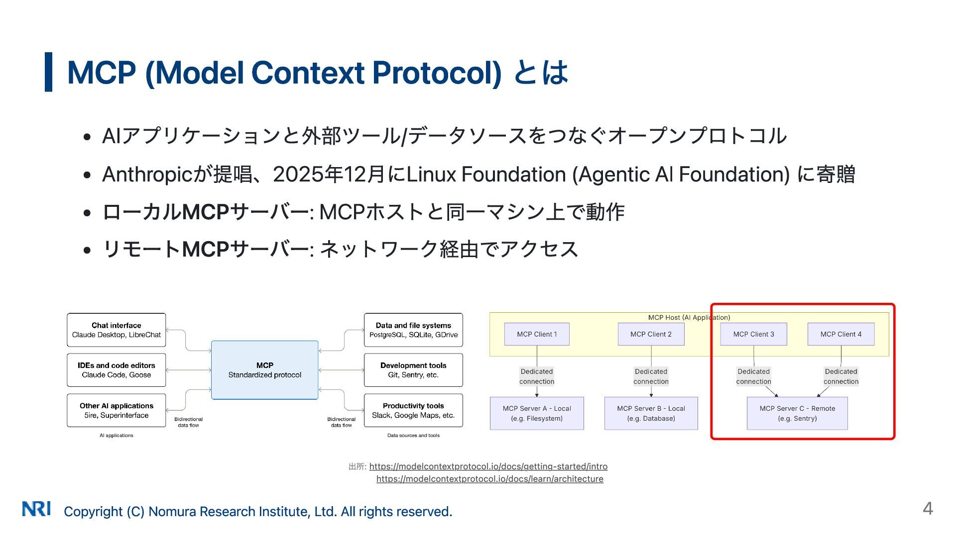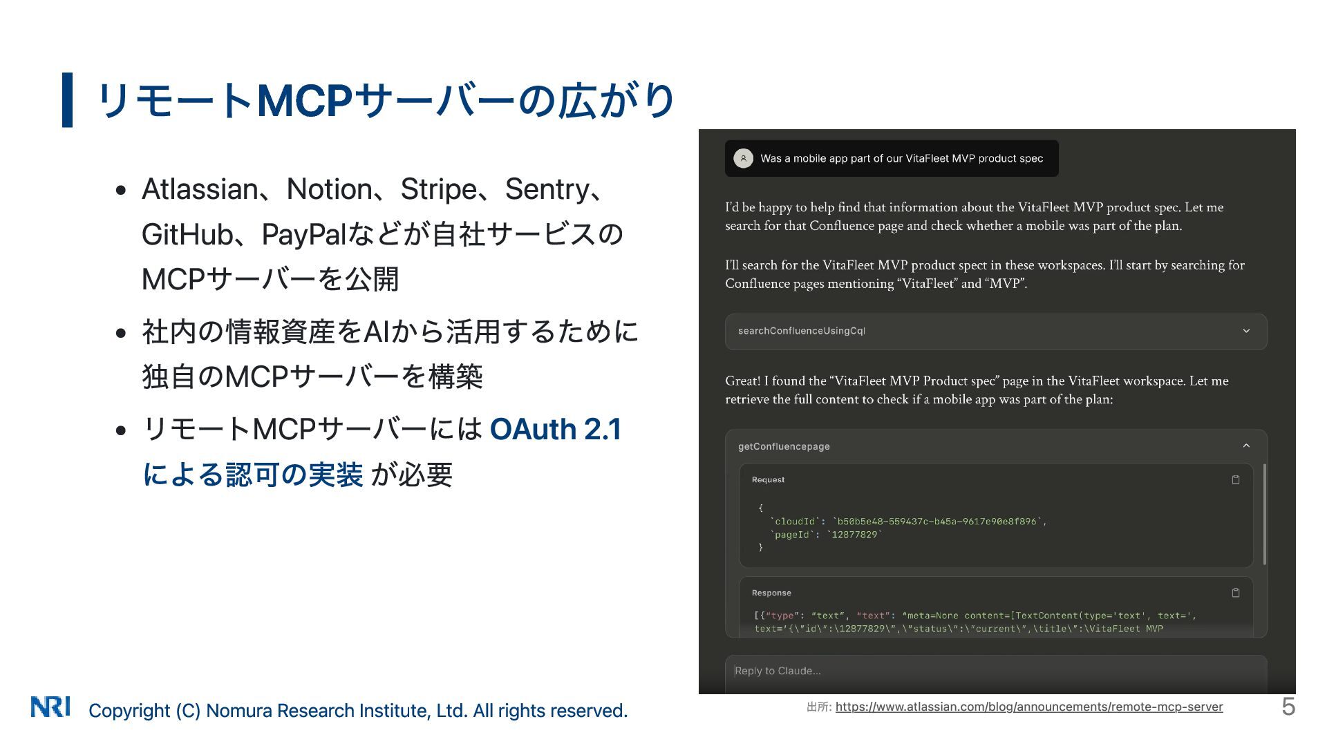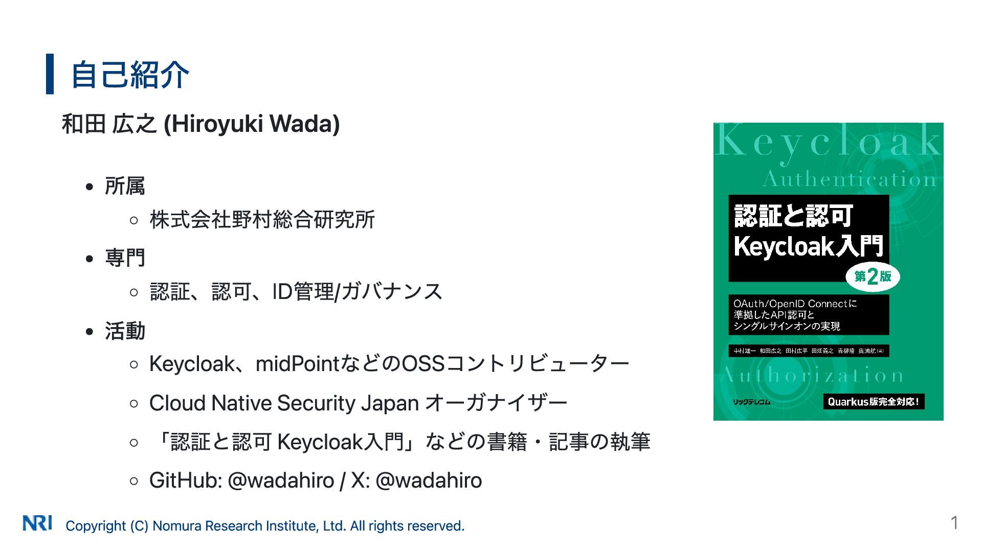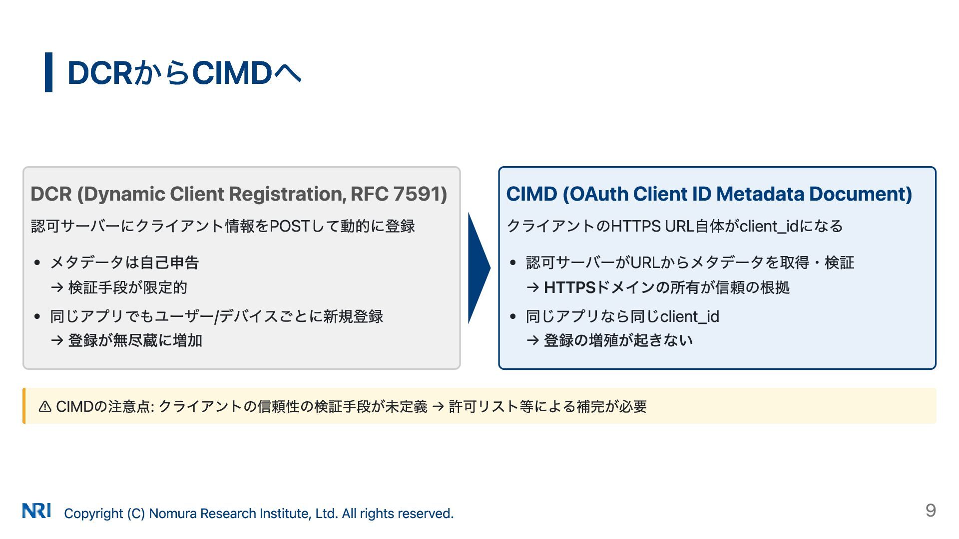 MUST MUST Supported OAuth 2.0 Authorization Server Metadata (RFC 8414) MUST MUST MUST Supported Resource Indicators for OAuth 2.0 (RFC 8707) MUST MUST — Not supported OAuth 2.0 Dynamic Client Registration (RFC 7591) MAY SHOULD SHOULD Supported OAuth Client ID Metadata Document SHOULD — — Not supported MCP Version Conformance 2025-03-26 Supported 2025-06-18 Partially Supported without Resource Indicators for OAuth 2.0 2025-11-25 Partially Supported without Resource Indicators for OAuth 2.0 and OAuth Client ID Metadata Document KeycloakのMCP認可の対応状況 出所: https://www.keycloak.org/securing-apps/mcp-authz-server ※ RFC 9728 OAuth 2.0 Protected Resource Metadata はResource Server(MCPサーバー)側の仕様のため記載なし Copyright (C) Nomura Research Institute, Ltd. All rights reserved. 14