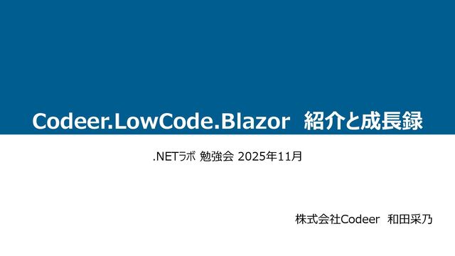 ◼ ローコード開発開始 Codeer.LowCode.Blazor を使って請求書画面を作成 →1日で完成し、感動 ◼ 展示会参加 製品の特長を学ぶ ◼ 提案に向けてデモ作成 とにかくたくさん製品を使って開 発し、製品の理解を深める →できることが増え、自信がつく ◼ アウトプット 開発での気づきをもとにマニュア ル作成やブラシュアップを行う ◼ 開発をメインで担当 スピード感をもって開発 改善もすぐ実施 →実際に使われる機能を実現 ◼ ローコード開発研修 製品の基本的な使い方をハン ズオンで実施 使う→伝える を何度も繰り返すことで 短期間で案件のメインを担当できるようになった