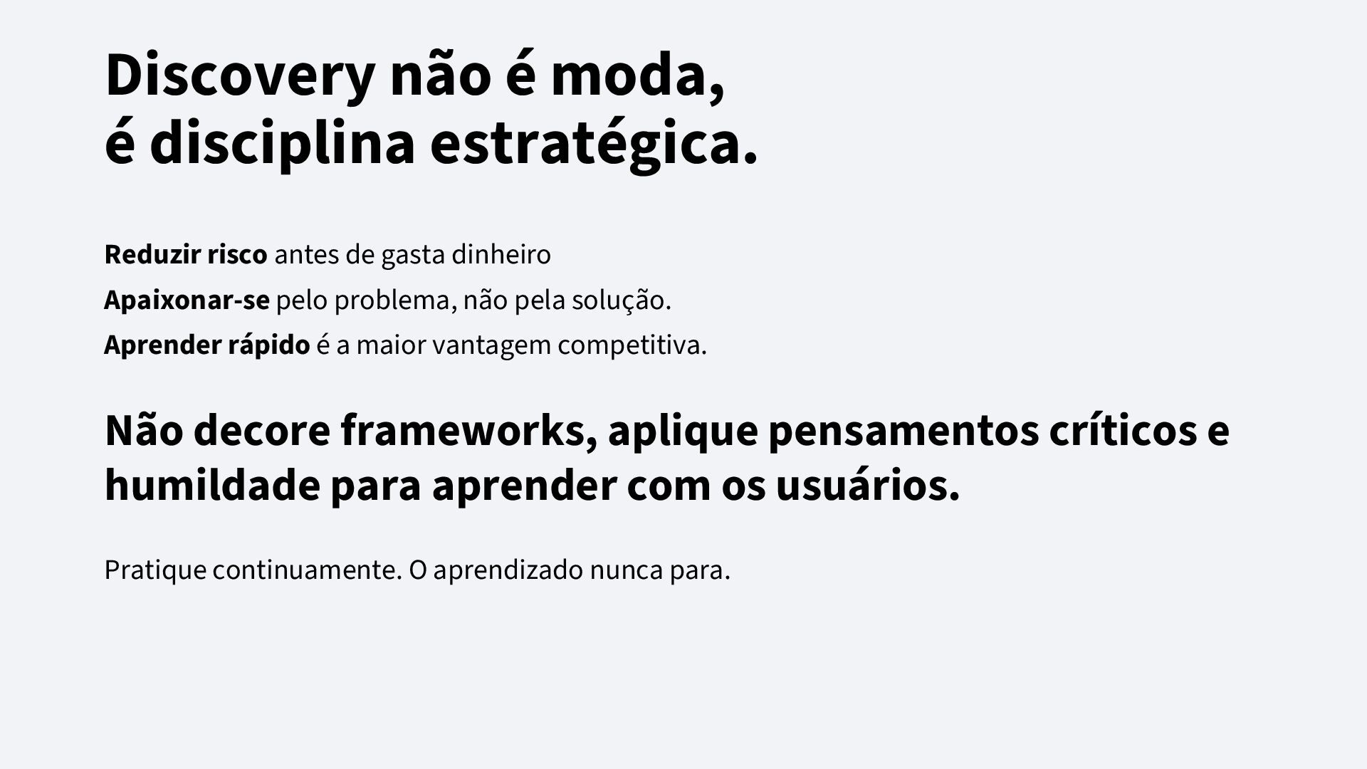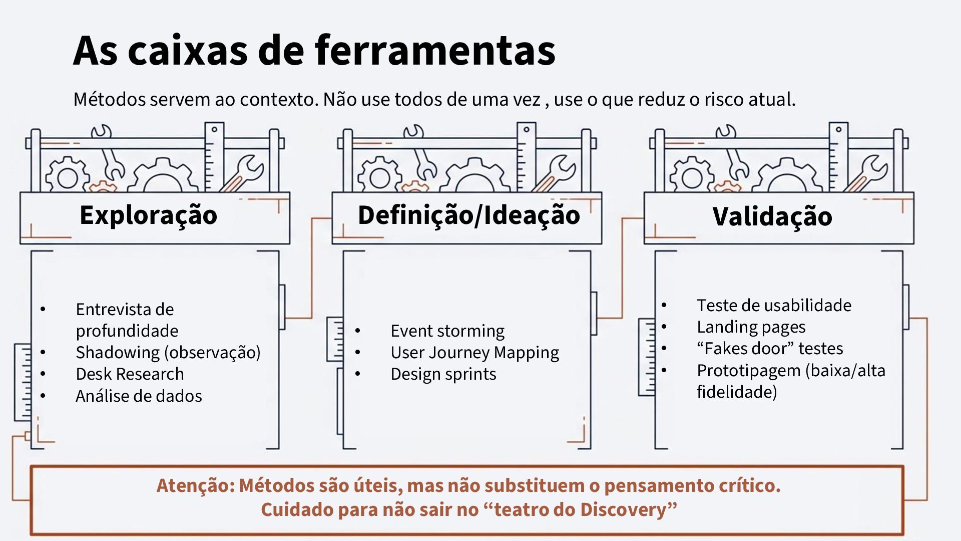 todos de uma vez , use o que reduz o risco atual. Exploração Definição/Ideação Validação • Entrevista de profundidade • Shadowing (observação) • Desk Research • Análise de dados • Event storming • User Journey Mapping • Design sprints • Teste de usabilidade • Landing pages • “Fakes door” testes • Prototipagem (baixa/alta fidelidade) Atenção: Métodos são úteis, mas não substituem o pensamento crítico. Cuidado para não sair no “teatro do Discovery”