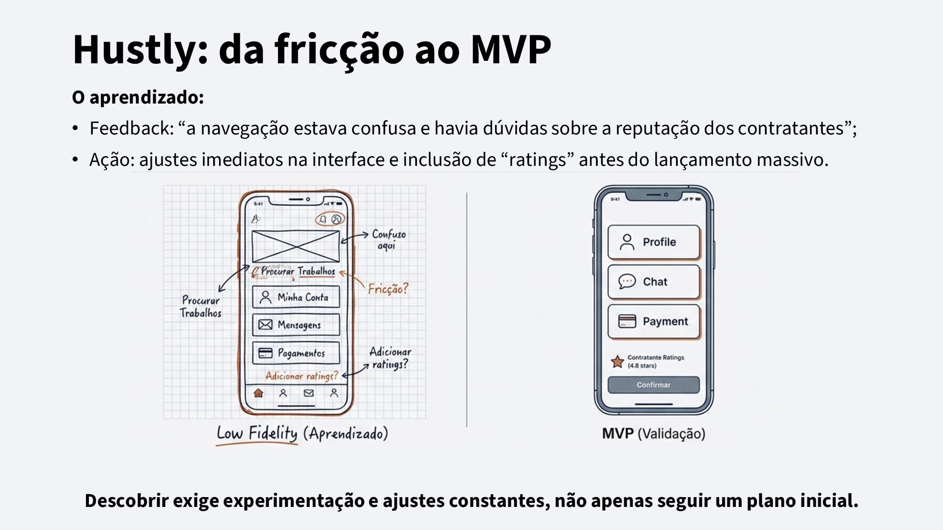 navegação estava confusa e havia dúvidas sobre a reputação dos contratantes”; • Ação: ajustes imediatos na interface e inclusão de “ratings” antes do lançamento massivo. Descobrir exige experimentação e ajustes constantes, não apenas seguir um plano inicial.