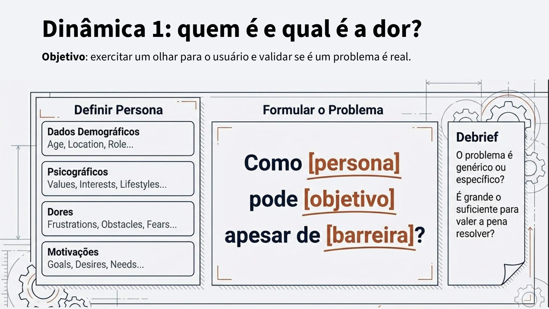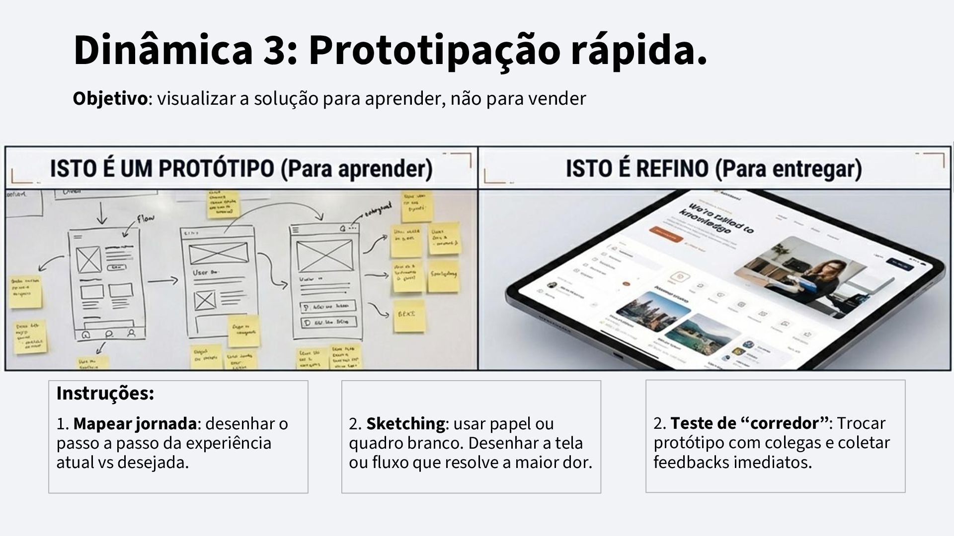 não para vender Instruções: 1. Mapear jornada: desenhar o passo a passo da experiência atual vs desejada. 2. Sketching: usar papel ou quadro branco. Desenhar a tela ou fluxo que resolve a maior dor. 2. Teste de “corredor”: Trocar protótipo com colegas e coletar feedbacks imediatos.