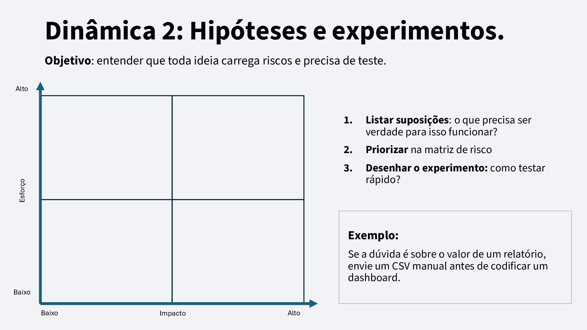carrega riscos e precisa de teste. 1. Listar suposições: o que precisa ser verdade para isso funcionar? 2. Priorizar na matriz de risco 3. Desenhar o experimento: como testar rápido? Exemplo: Se a dúvida é sobre o valor de um relatório, envie um CSV manual antes de codificar um dashboard. Esforço Alto Alto Baixo Baixo Impacto