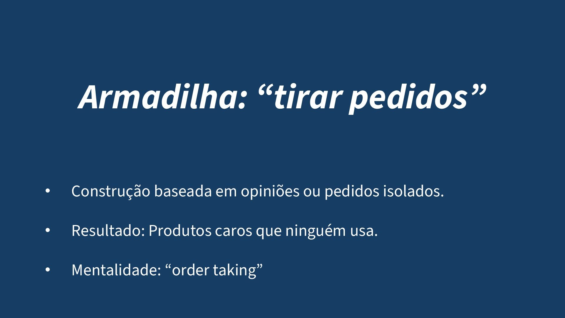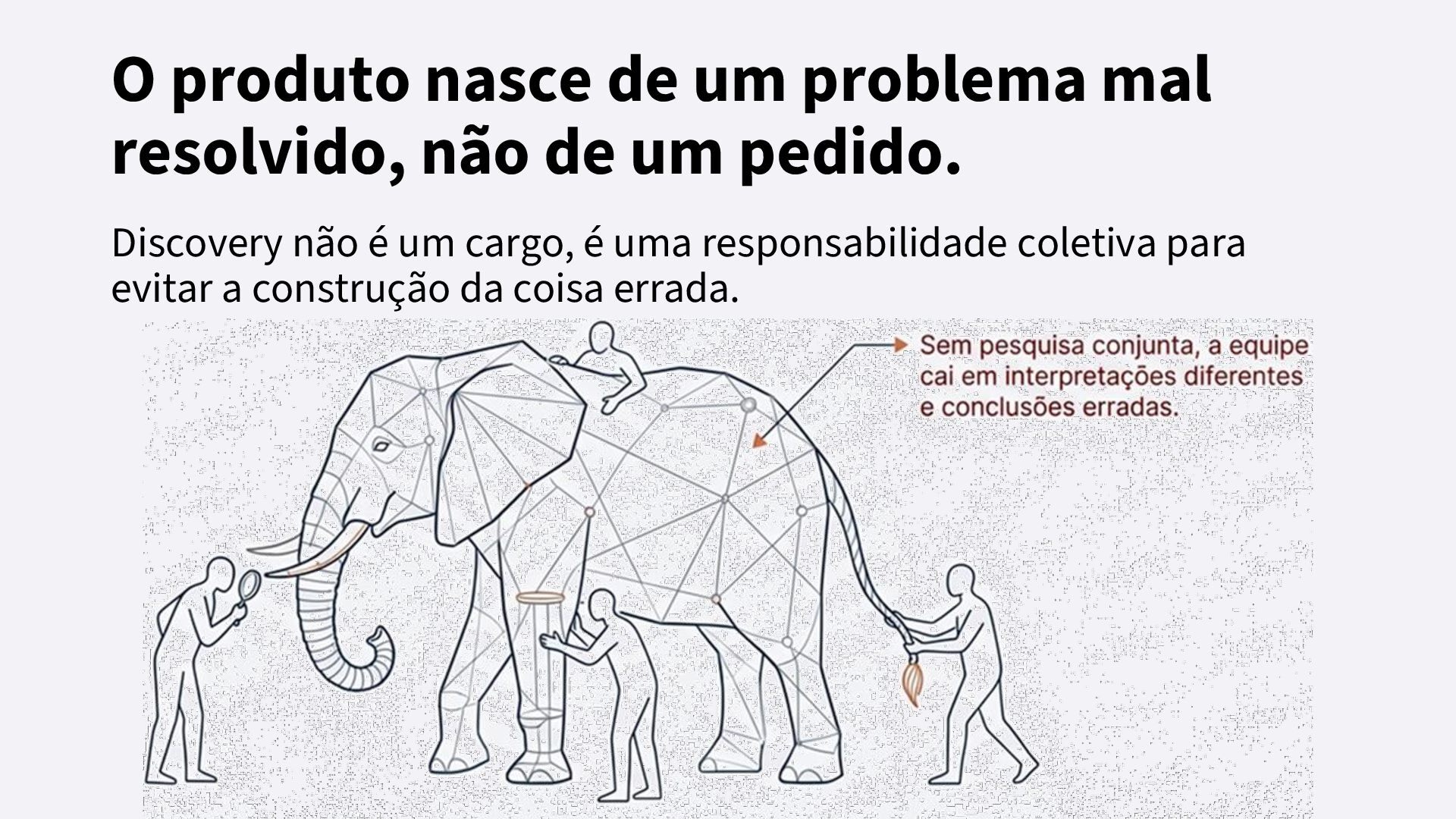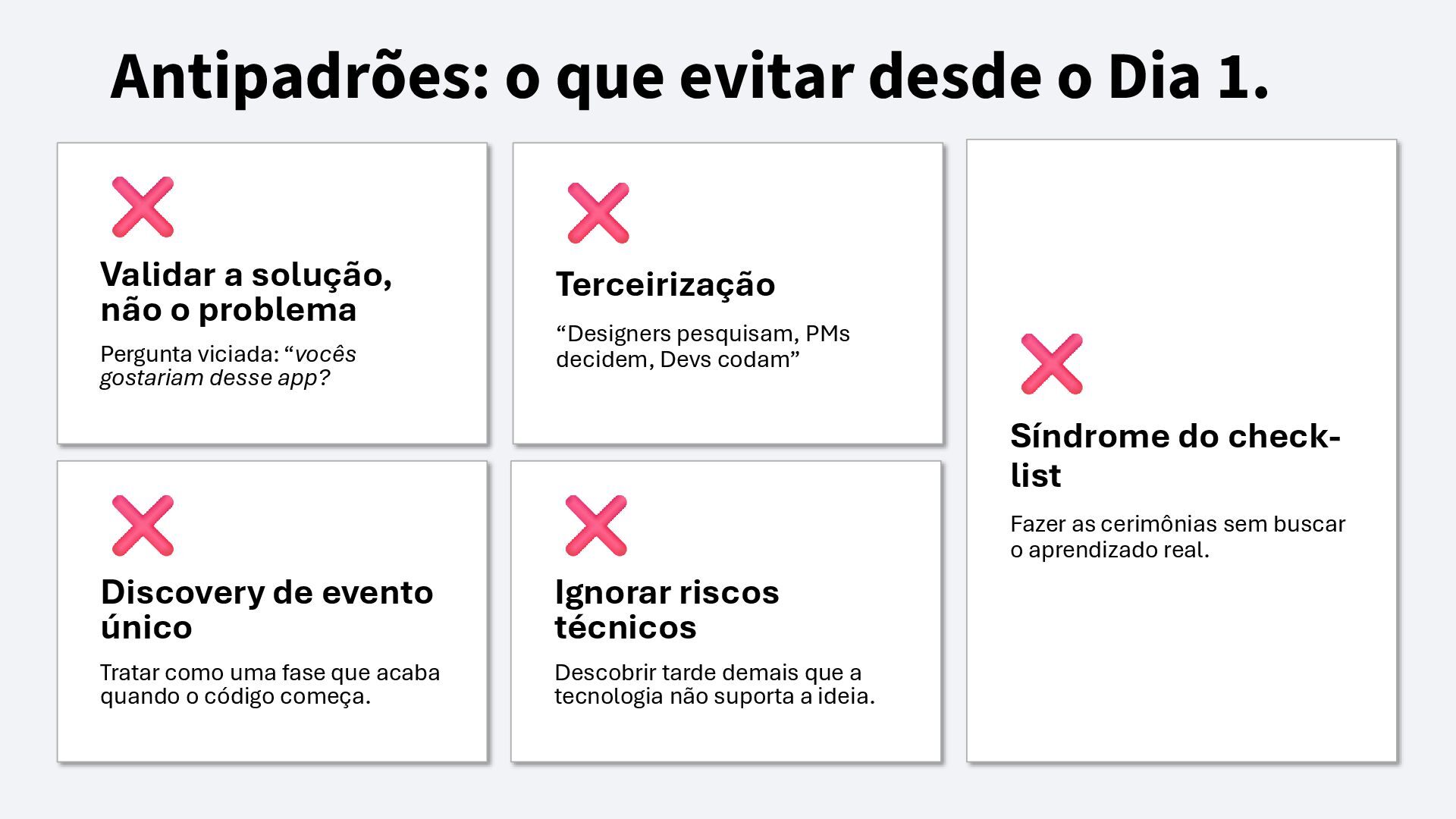 solução, não o problema Pergunta viciada: “vocês gostariam desse app? Discovery de evento único Tratar como uma fase que acaba quando o código começa. Terceirização “Designers pesquisam, PMs decidem, Devs codam” Ignorar riscos técnicos Descobrir tarde demais que a tecnologia não suporta a ideia. Síndrome do check- list Fazer as cerimônias sem buscar o aprendizado real.