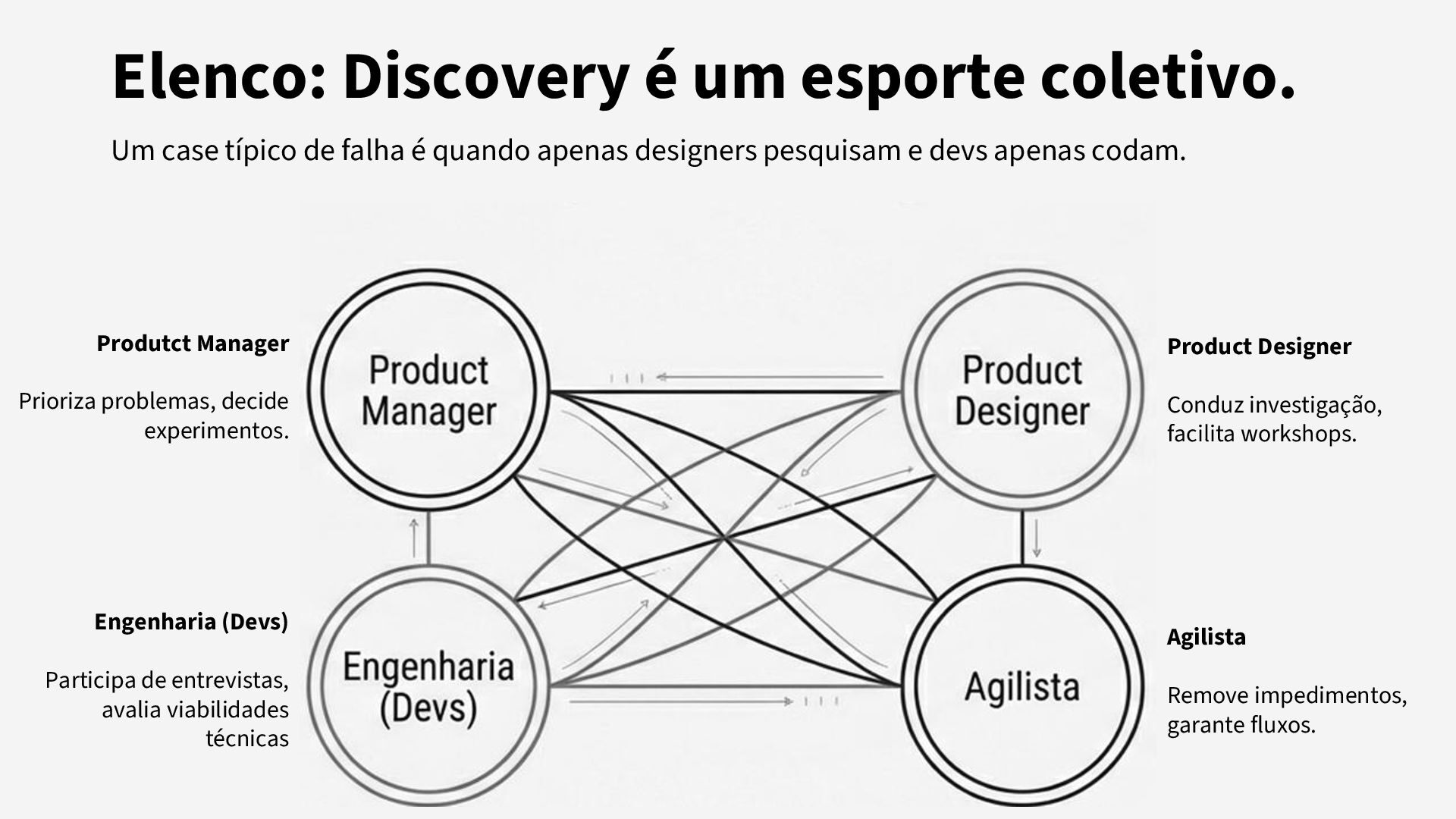 entrevistas, avalia viabilidades técnicas Agilista Remove impedimentos, garante fluxos. Produtct Manager Prioriza problemas, decide experimentos. Product Designer Conduz investigação, facilita workshops. Um case típico de falha é quando apenas designers pesquisam e devs apenas codam.
