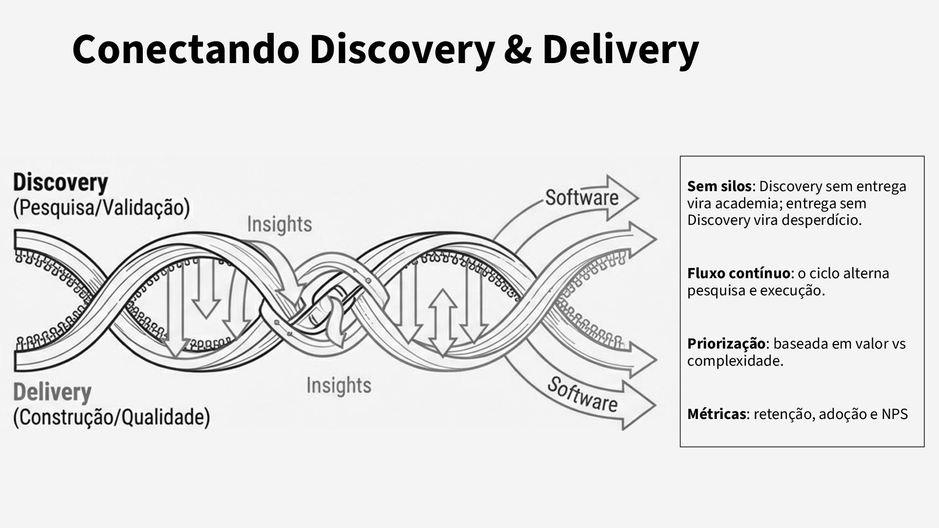 academia; entrega sem Discovery vira desperdício. Fluxo contínuo: o ciclo alterna pesquisa e execução. Priorização: baseada em valor vs complexidade. Métricas: retenção, adoção e NPS