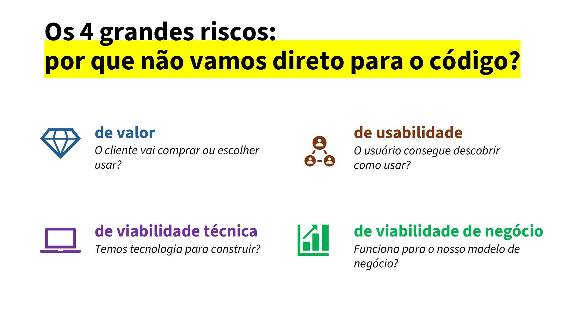 o código? de valor O cliente vai comprar ou escolher usar? de viabilidade técnica Temos tecnologia para construir? de usabilidade O usuário consegue descobrir como usar? de viabilidade de negócio Funciona para o nosso modelo de negócio?