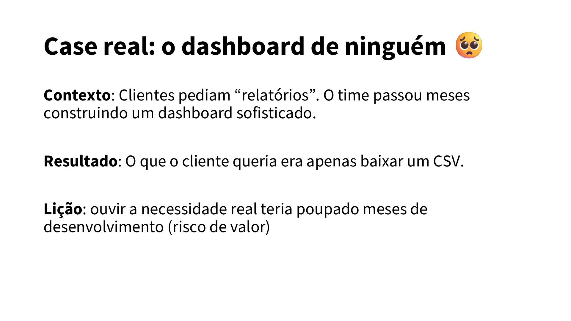 O time passou meses construindo um dashboard sofisticado. Resultado: O que o cliente queria era apenas baixar um CSV. Lição: ouvir a necessidade real teria poupado meses de desenvolvimento (risco de valor)