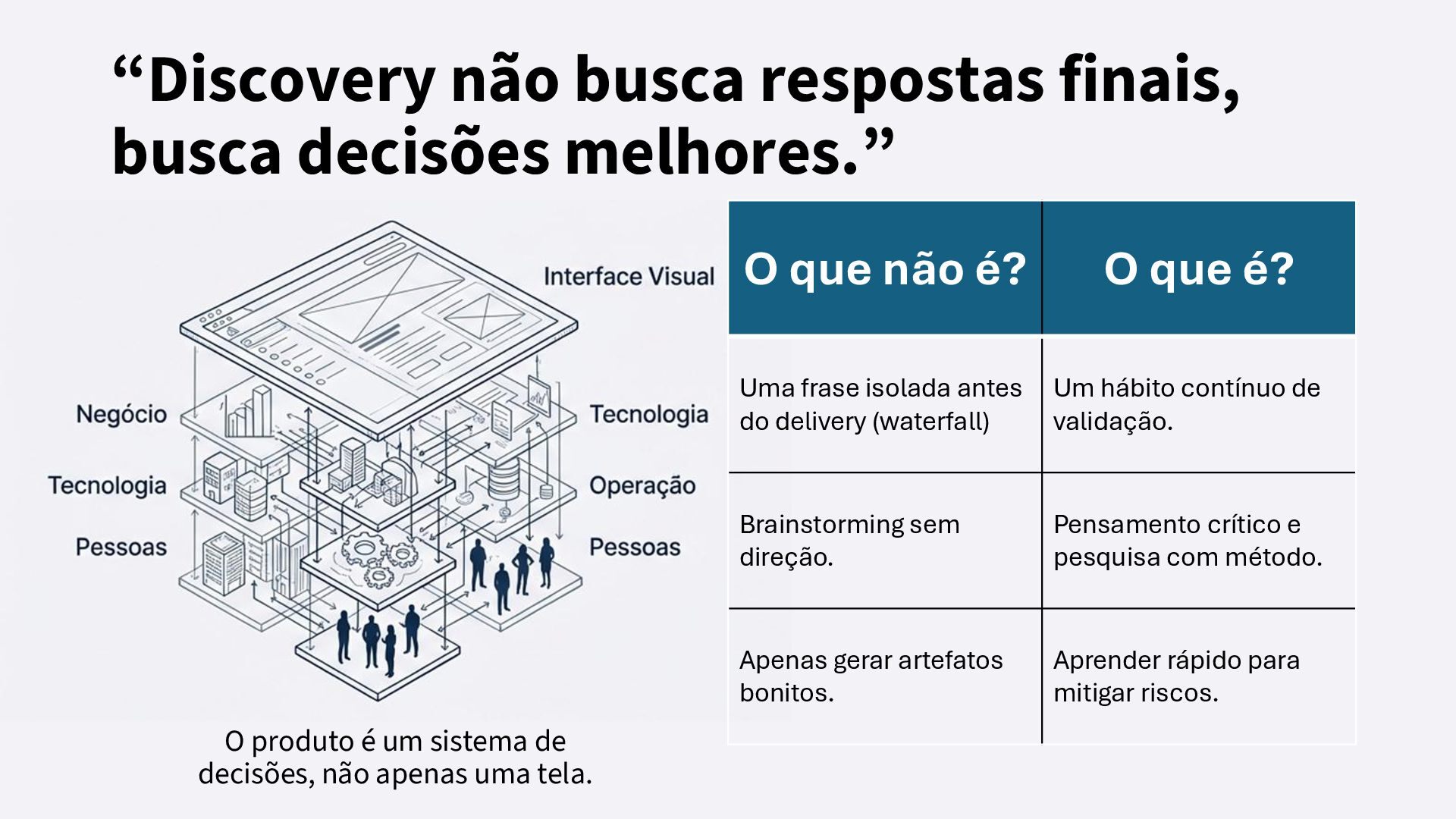 não é? O que é? Uma frase isolada antes do delivery (waterfall) Um hábito contínuo de validação. Brainstorming sem direção. Pensamento crítico e pesquisa com método. Apenas gerar artefatos bonitos. Aprender rápido para mitigar riscos. O produto é um sistema de decisões, não apenas uma tela.