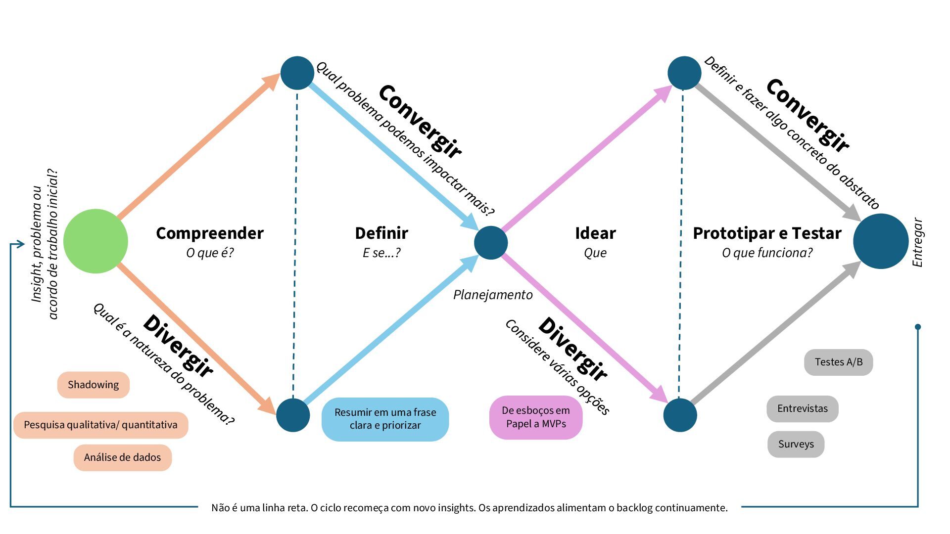 acordo de trabalho inicial? Planejamento Idear Que Prototipar e Testar O que funciona? Entregar Shadowing Pesquisa qualitativa/ quantitativa Análise de dados Resumir em uma frase clara e priorizar De esboços em Papel a MVPs Testes A/B Entrevistas Surveys Não é uma linha reta. O ciclo recomeça com novo insights. Os aprendizados alimentam o backlog continuamente.