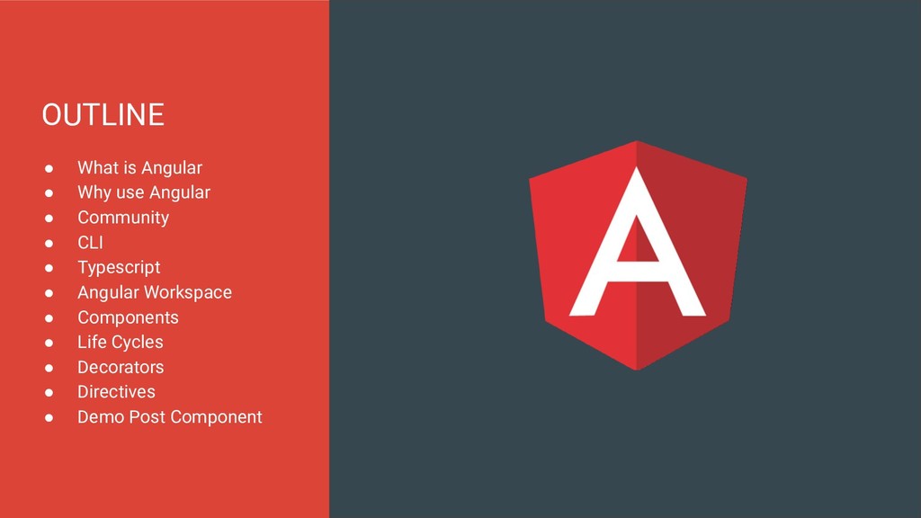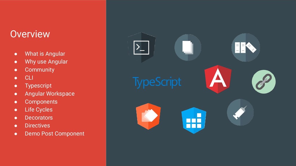 Community • CLI • Typescript • Angular Workspace • Components • Life Cycles • Decorators • Directives • Demo Post Component