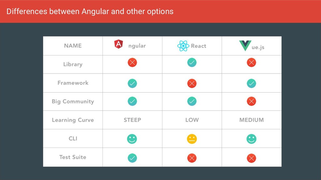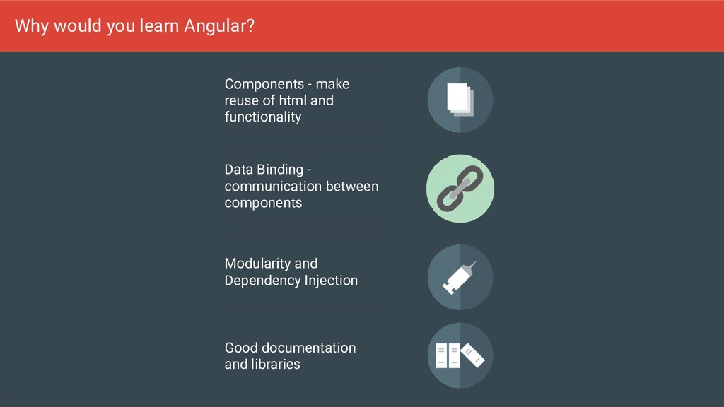 html and functionality Data Binding - communication between components Modularity and Dependency Injection Good documentation and libraries