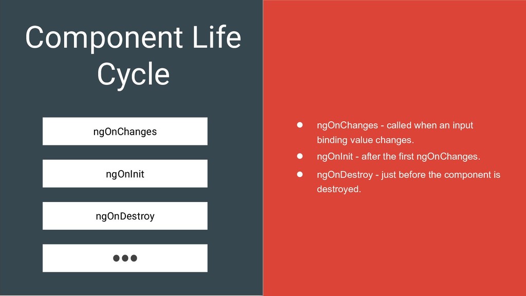 binding value changes. • ngOnInit - after the first ngOnChanges. • ngOnDestroy - just before the component is destroyed. ngOnChanges ngOnInit ngOnDestroy