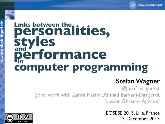 Talk given at the 2015 European Open Symposium on Empirical Software Engineering. It reports on a correlational study Zahra Karimi did while visiting our group in Stuttgart. It relates the personalities of programmers with their programmings styles as well as their performance (mainly the quality of their code).