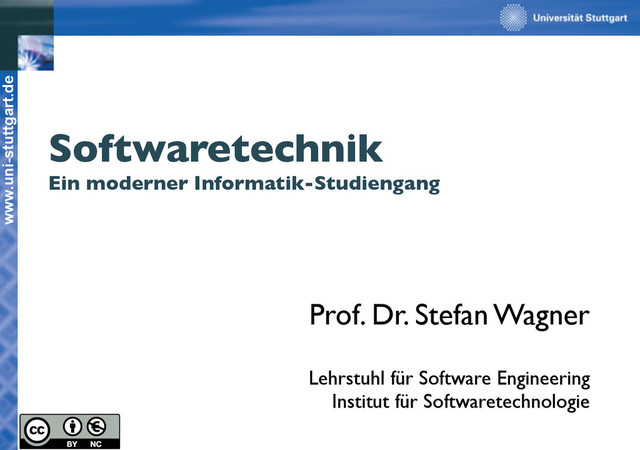 erreichbar sind, also: • Besuchen Sie unsere Web-Seiten! • Schauen Sie sich den Lehrbetrieb an, kommen Sie in unsere Vorlesungen! • Reden Sie mit Studierenden, erkundigen Sie sich nach deren Erfahrungen und Empfehlungen! • Fragen Sie Praktiker der Informatik nach ihrer Meinung über unseren Studienplan und unsere Schwerpunkte! Verarbeiten Sie all diese Informationen, um daraus die richtige Entscheidung abzuleiten. Aber treffen Sie keine Entscheidung, an die Sie selbst nicht glauben. Bewerbung bis zum 15.07.: www.uni-stuttgart.de/studieren/bewerbung/leitfaden Wir freuen uns auf Sie in der Softwaretechnik!