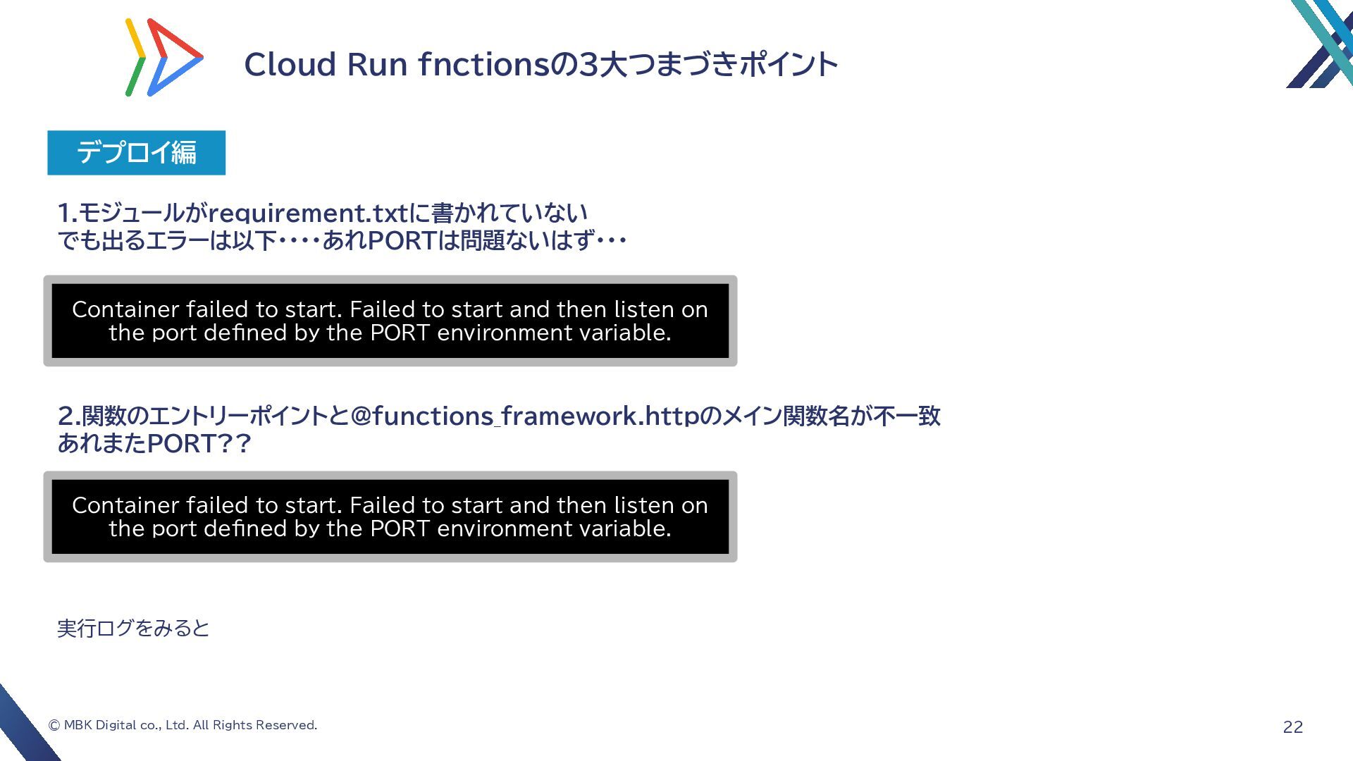 Run fnctionsの3大つまづきポイント 実行ログをみると 1.モジュールがrequirement.txtに書かれていない でも出るエラーは以下・・・・あれPORTは問題ないはず・・・ デプロイ編 Container failed to start. Failed to start and then listen on the port defined by the PORT environment variable. 2.関数のエントリーポイントと@functions_framework.httpのメイン関数名が不一致 あれまたPORT?? Container failed to start. Failed to start and then listen on the port defined by the PORT environment variable.