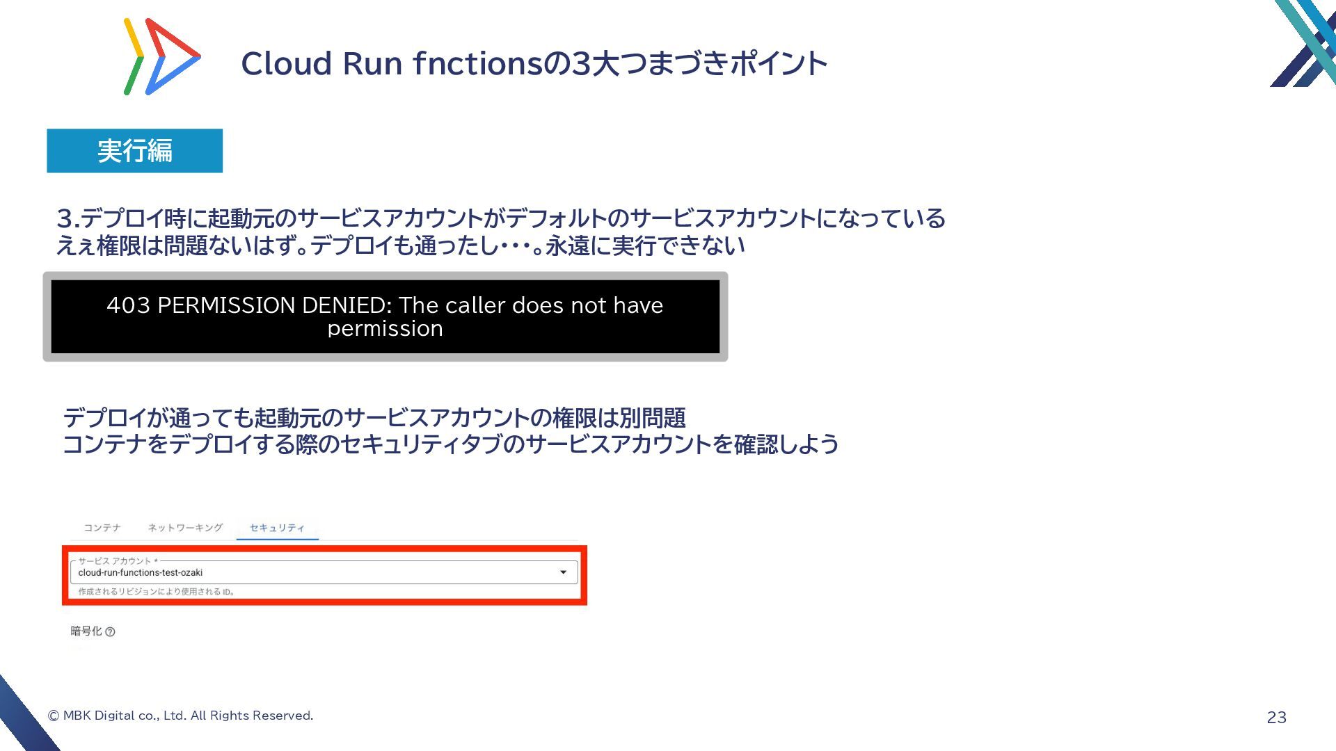 Run fnctionsの3大つまづきポイント 3.デプロイ時に起動元のサービスアカウントがデフォルトのサービスアカウントになっている えぇ権限は問題ないはず。デプロイも通ったし・・・。永遠に実行できない 実行編 403 PERMISSION_DENIED: The caller does not have permission デプロイが通っても起動元のサービスアカウントの権限は別問題 コンテナをデプロイする際のセキュリティタブのサービスアカウントを確認しよう