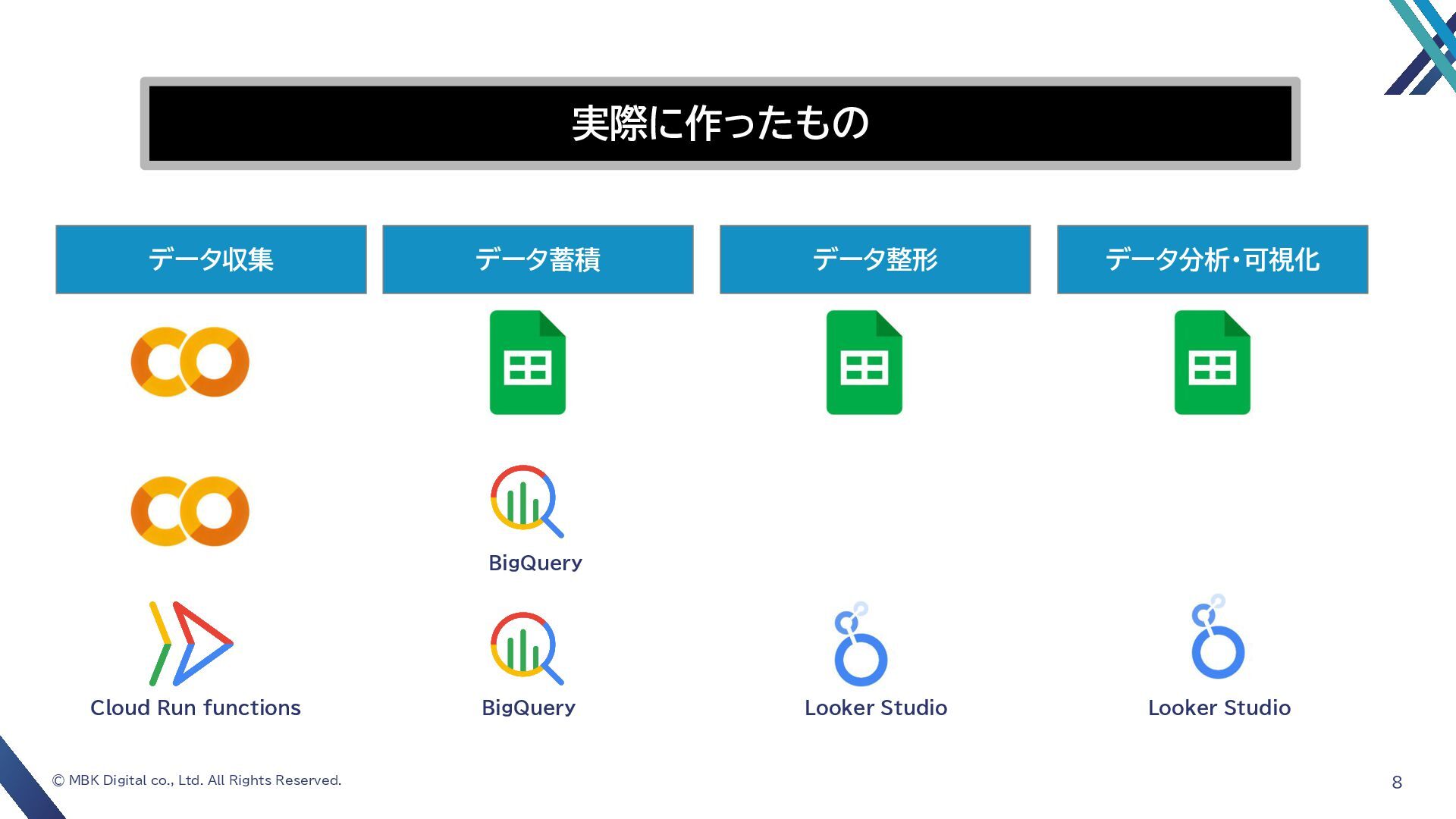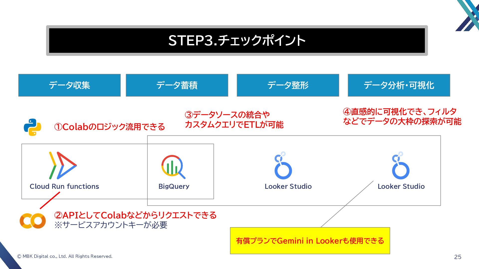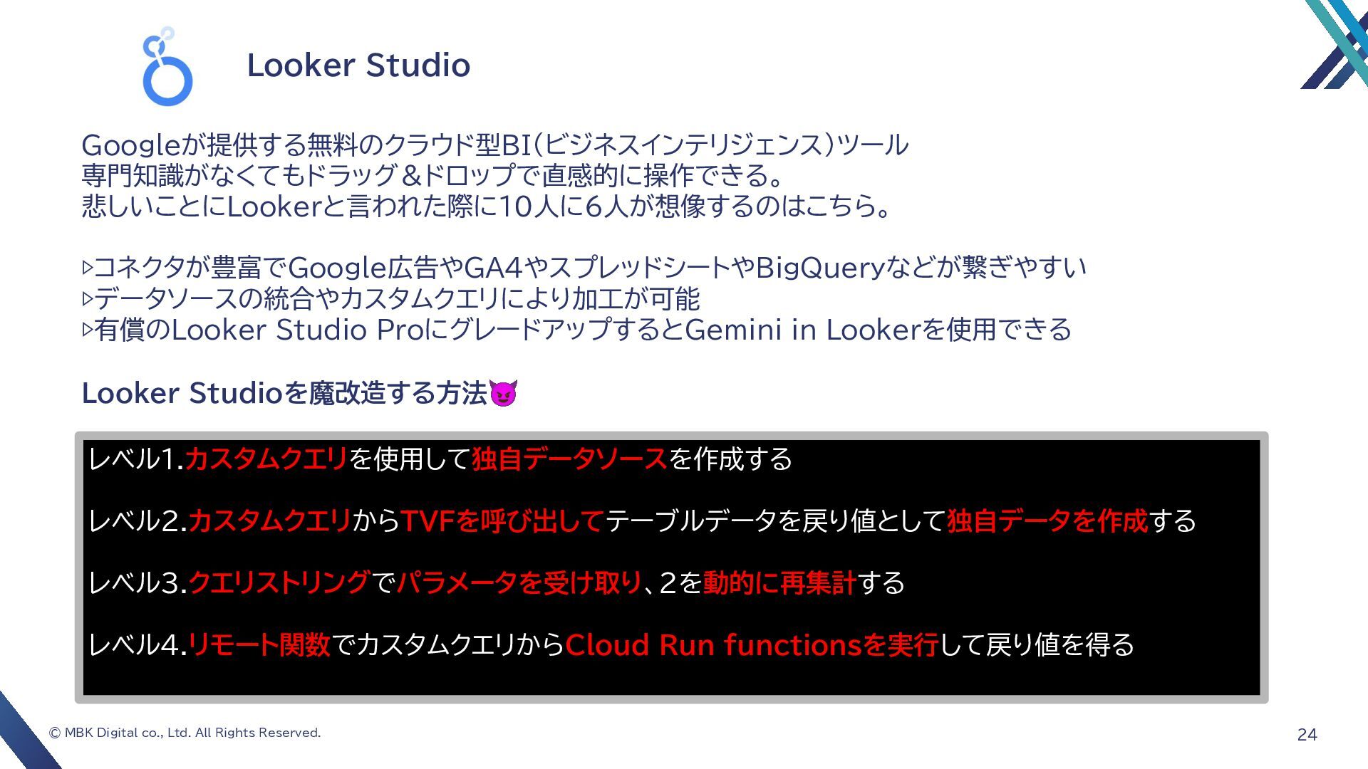 専門知識がなくてもドラッグ&ドロップで直感的に操作できる。 悲しいことにLookerと言われた際に10人に6人が想像するのはこちら。 ▷コネクタが豊富でGoogle広告やGA4やスプレッドシートやBigQueryなどが繋ぎやすい ▷データソースの統合やカスタムクエリにより加工が可能 ▷有償のLooker Studio ProにグレードアップするとGemini in Lookerを使用できる Looker Studioを魔改造する方法😈 Looker Studio レベル1.カスタムクエリを使用して独自データソースを作成する レベル2.カスタムクエリからTVFを呼び出してテーブルデータを戻り値として独自データを作成する レベル3.クエリストリングでパラメータを受け取り、2を動的に再集計する レベル4.リモート関数でカスタムクエリからCloud Run functionsを実行して戻り値を得る