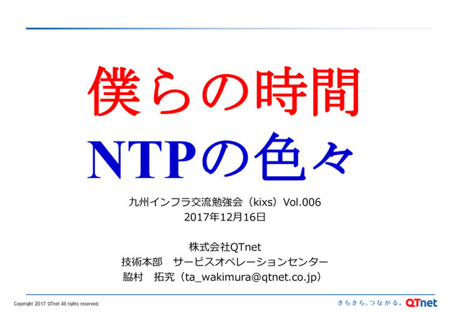 めに追加(または削除)する1秒 n NTP運⽤者を悩ませる1秒 n うるう秒追加される場合のイメージ(JST) n 不定期に実施される n 最近は2年〜3年毎であることが多いが、この頻度は⾼まっていく可能性が⼤きいらしい n 不定期ではあるが基本的には1⽉1⽇か、7⽉1⽇となる(JSTの場合) n ⽇本を含めうるう秒廃⽌派もいて、2023年までに検討が⾏われる模様 n NTPではLeap Indicatorというフラグをセットすることでこの実施情報が伝え られる n うるう秒無し(00)、追加のうるう秒(01)、削除のうるう秒(10)、状態不明(11) n うるう秒でなくても、例えば同期先を全て失ってしまったNTPサーバはフラグをセットする -13- 普段の始業時間 うるう秒のある始業時間 08:59:59 08:59:59 09:00:00 08:59:60 09:00:01 09:00:00 09:00:02 09:00:01