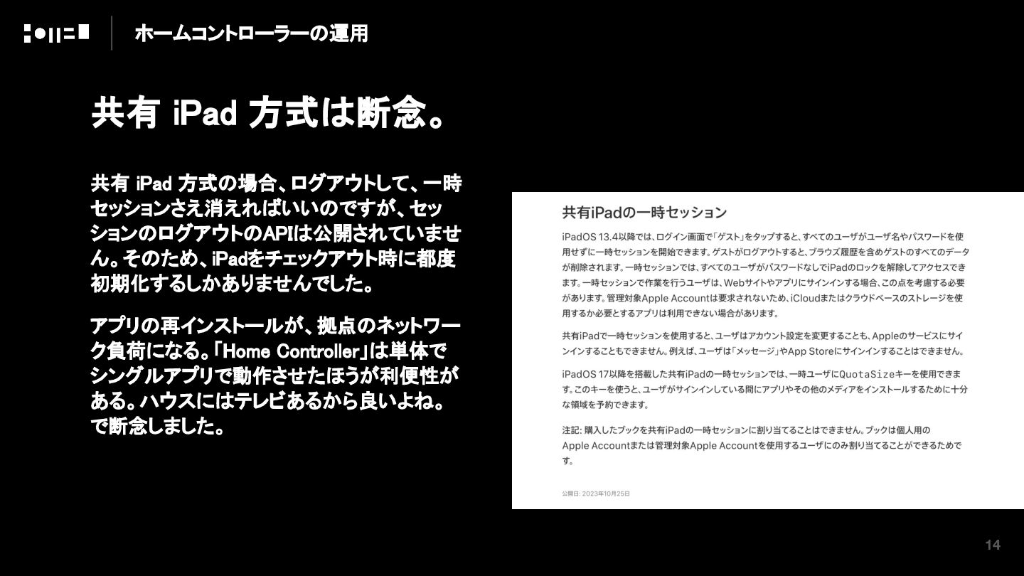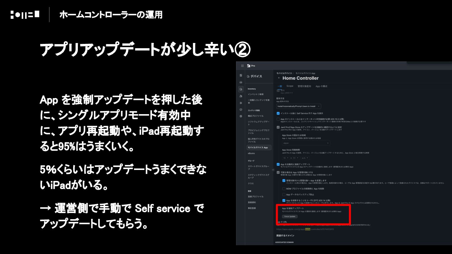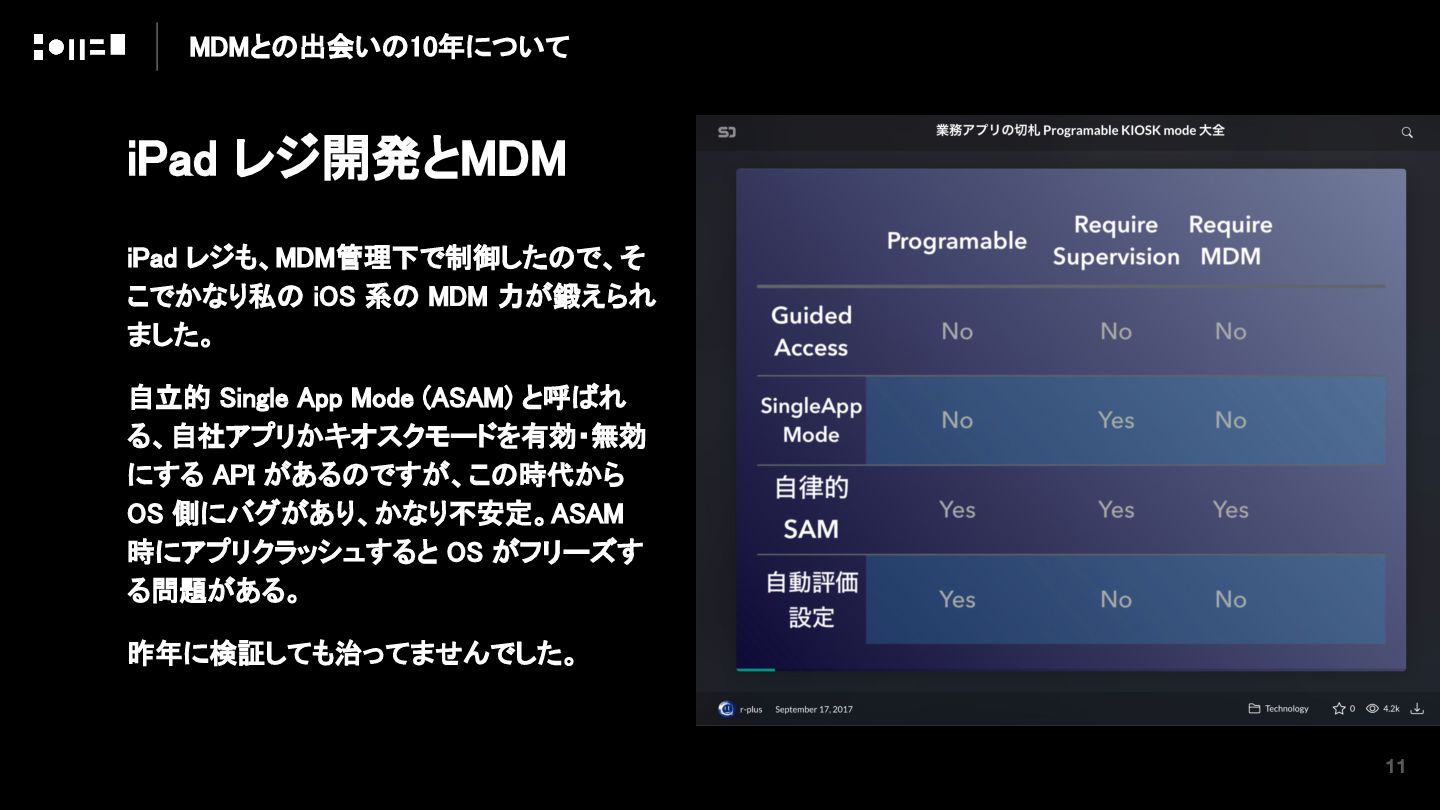 Single App Mode (ASAM) と呼ばれ る、自社アプリかキオスクモードを有効・無効 にする API があるのですが、この時代から OS 側にバグがあり、かなり不安定。ASAM 時にアプリクラッシュすると OS がフリーズす る問題がある。 昨年に検証しても治ってませんでした。 iPad レジ開発とMDM MDMとの出会いの10年について 11