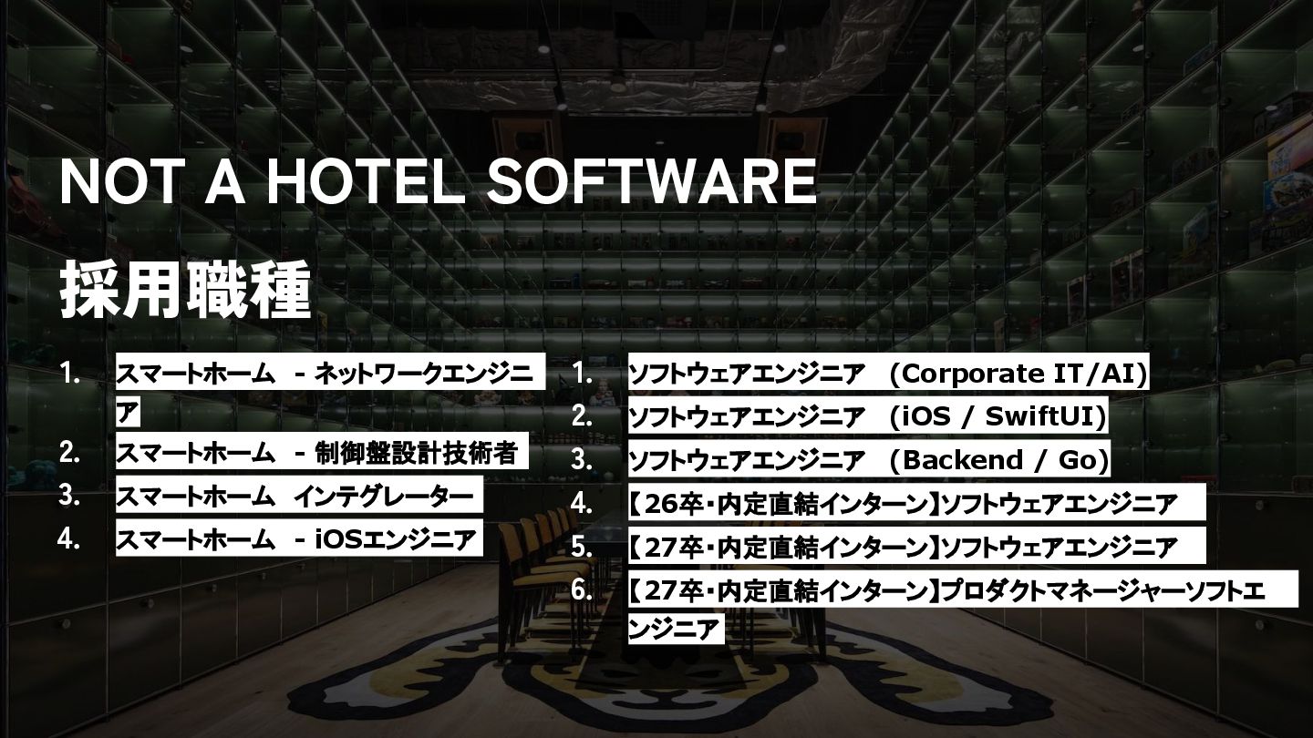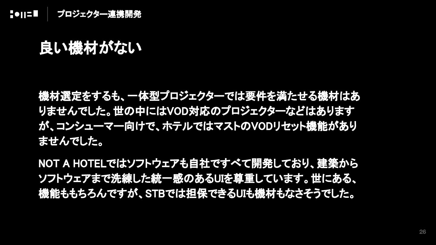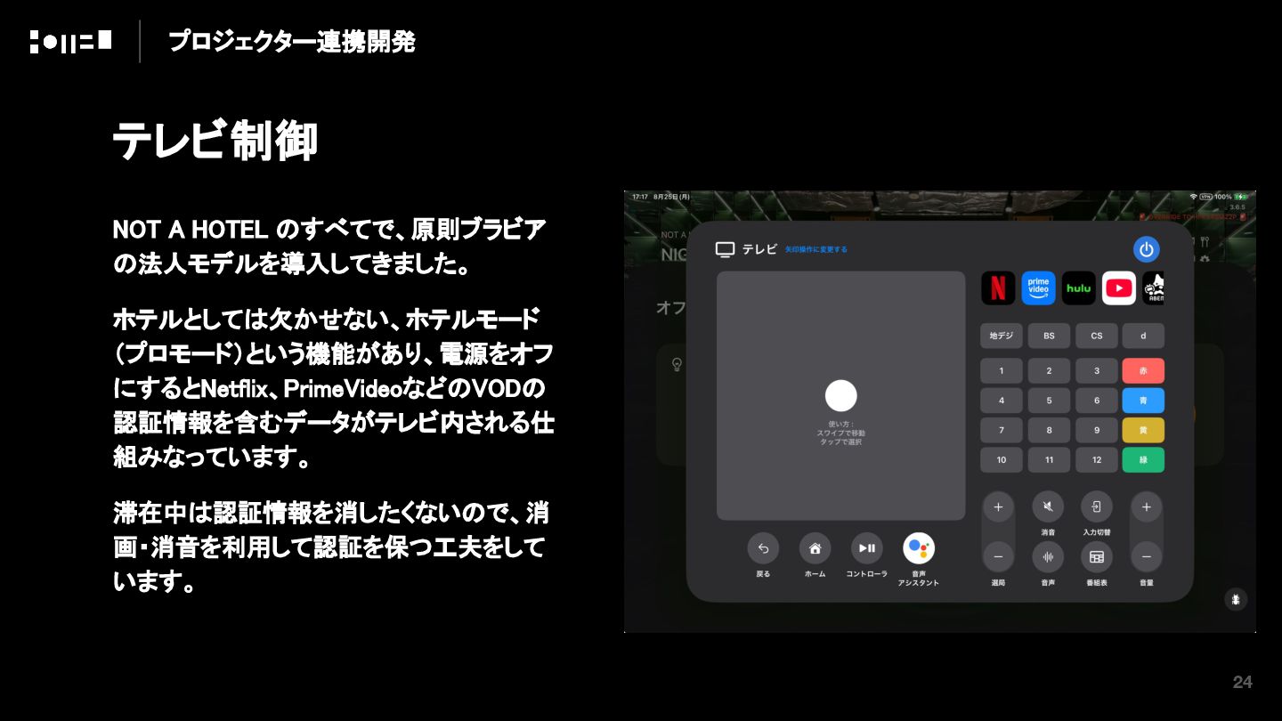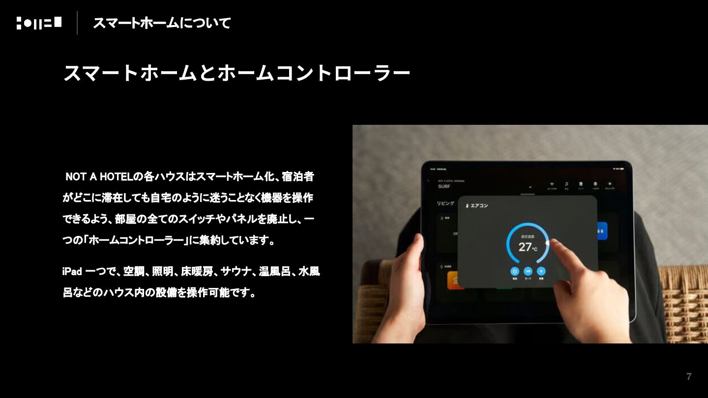 NOT A HOTEL の宿泊施設では、ホームコントローラーとして iPad を中心に空調・照明・サウナなどを制御し、Apple TV やプロジェクターなども連携しています。
