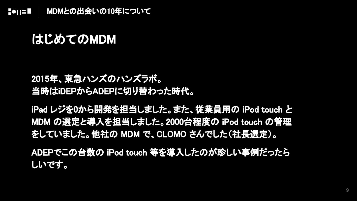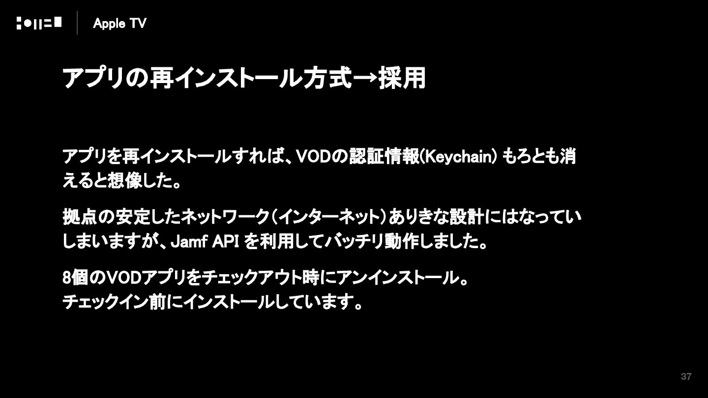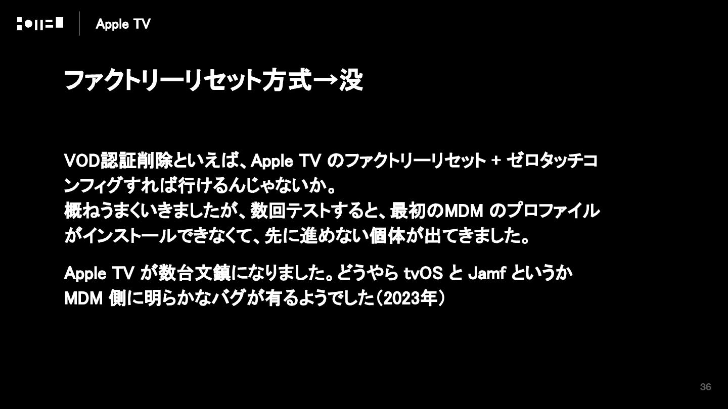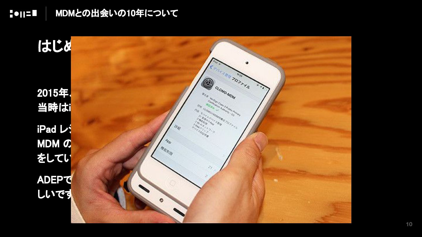 本スライドでは、共有 iPad の課題、Managed App Configuration やシングルアプリ運用、VOD 機材との連携、MDM 運用上の工夫など、現場での知見を具体的にまとめています。