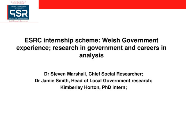 services; • ESRC internship scheme: – Overview; – Welsh Government approach; – Experiences from an existing intern; • The role of evidence and research in Government; • Careers in Government; • Questions