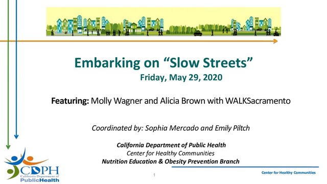 Wagner and Alicia Brown with WALKSacramento Coordinated by: Sophia Mercado and Emily Piltch California Department of Public Health Center for Healthy Communities Nutrition Education & Obesity Prevention Branch Center for Healthy Communities 1