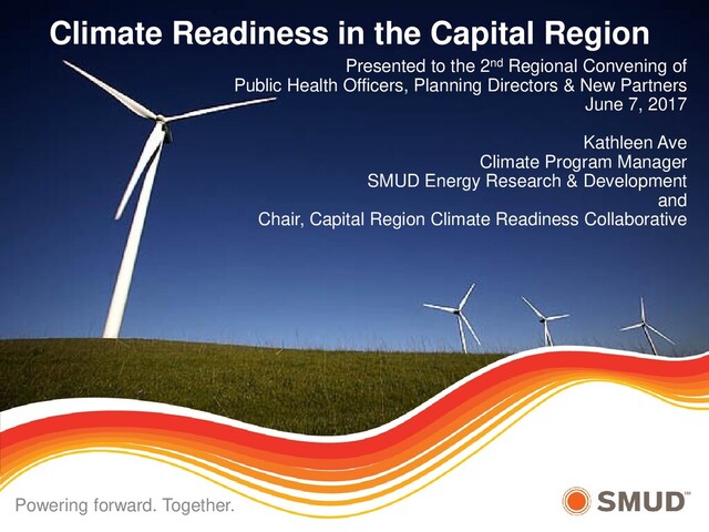 Climate Readiness Collaborative All Ongoing Community Engagement Regional Urban Heat Island Initiative Temperature Beginning 2017 Community Engagement Regional Biosequestration All Begin Dec. 2017 Enterprise Program Sacramento Resilient Grid Initiative (REDI Grant) Flooding Complete Dec. 2017 Enterprise Program Climate Change And Enterprise Risk Management All Monthly Review Enterprise Program Customer Program Evaluation and Metrics Research All Complete 2017 Enterprise Program Environmental Sustainability All Complete Dec. 2020 Enterprise Program Long Range Asset Management Plan All Complete 2017 Enterprise Program Focused Climate Research Hydrology, Wind To be Determined Enterprise Program Contract Climate Exposure Evaluation All Pilot Launch 2017 Enterprise Program Flood Data Analysis and Preparedness Planning Flooding Complete 2017 Enterprise Program Emergency Preparedness All Ongoing Capital Project SPA County Recycled Water Project Drought, Hydrology Fall 2017 Capital Project SMUD Nature preserve Mitigation Bank Native Species Operational 2014 Monitoring Through 2017 Capital Project SMUD Headquarters Design and Renovation All Renovation Began 2016 Operational Initiative Forest Thinning, Stream and Revenue Flows in UARP Wildfire 2017 - 2021 Operational Initiative Unmanned Aerial Systems Risk Identification Program Wildfire Annual Operational Initiative Cloud Seeding Drought Annual Operational Initiative Hydropower Risk Mitigation Strategies Drought, Hydrology, Wildfire Ongoing Operational Initiative SMUD Cool Roof Incentive Temperature Ongoing Operational Initiative SMUD Shade Tree Program Temperature Ongoing Operational Initiative Savings By Design ILFI Incentive All Ongoing Operational Initiative AB327 / More than Smart Grid Modernization Research All 2016-2020 Operational Initiative Distributed Energy Resource Strategy All 2016-2020 Action Plan Summary