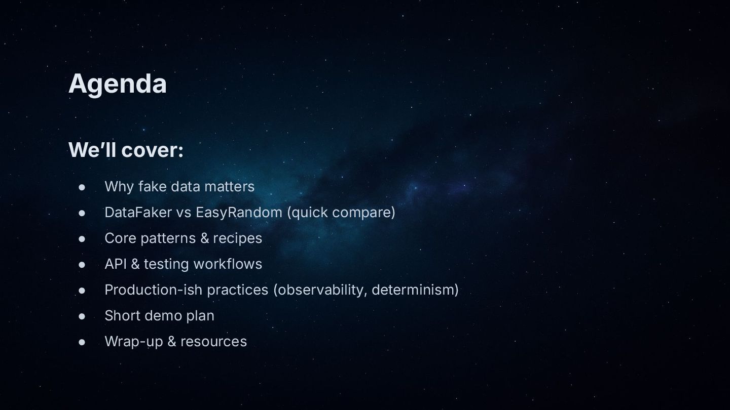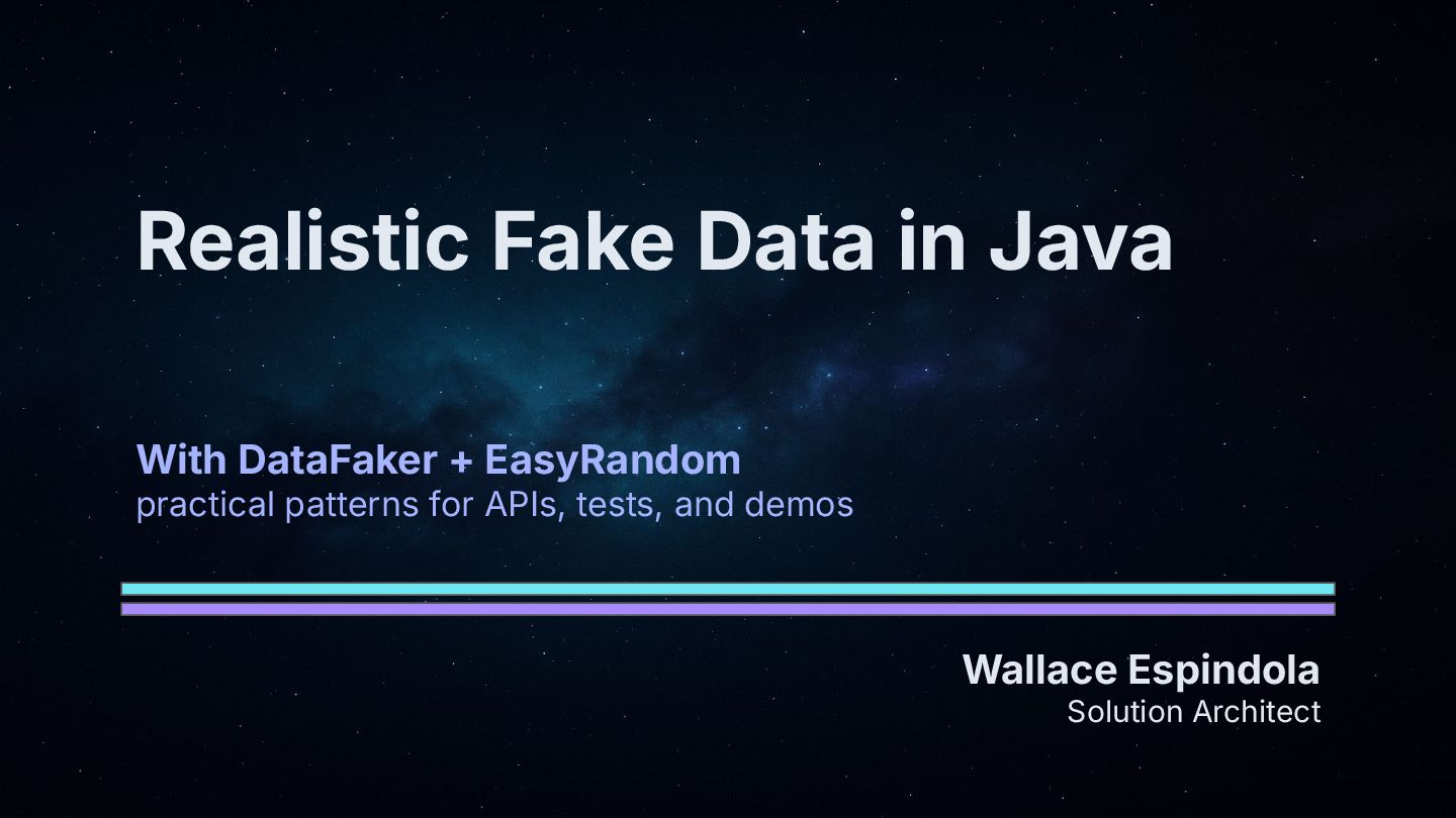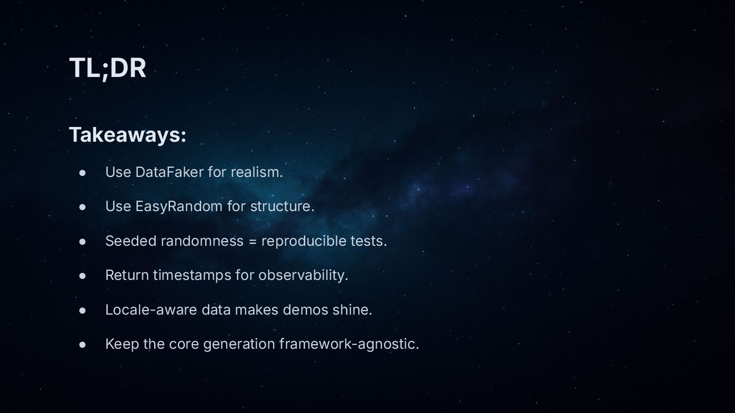 • TL;DR: EasyRandom gives structure, DataFaker gives realism—together they produce production-like test data fast.