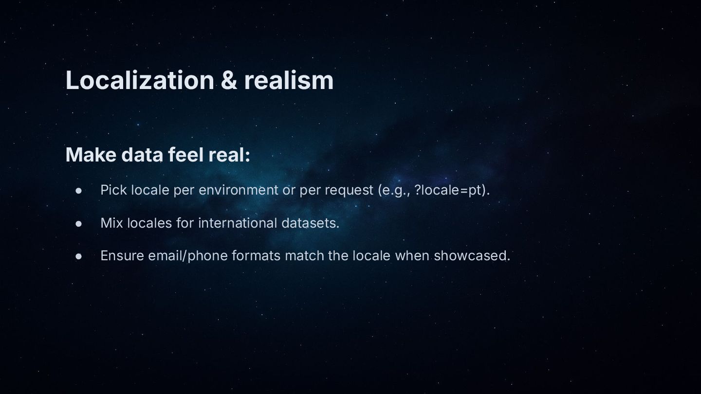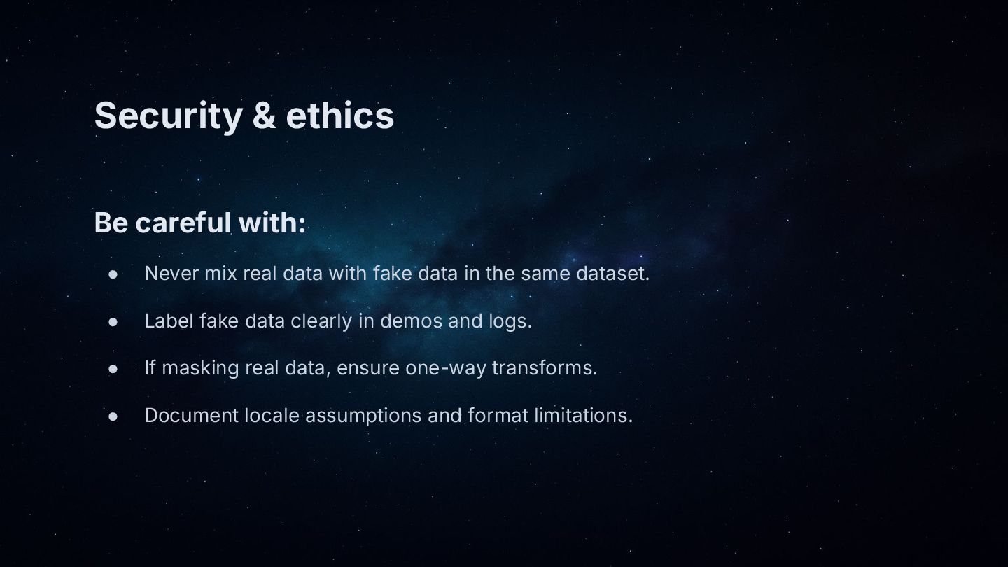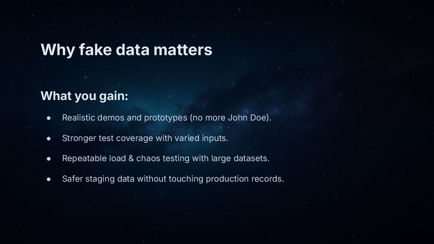 • Why fake data matters: demos that feel real, safer staging, better tests and load simulations.