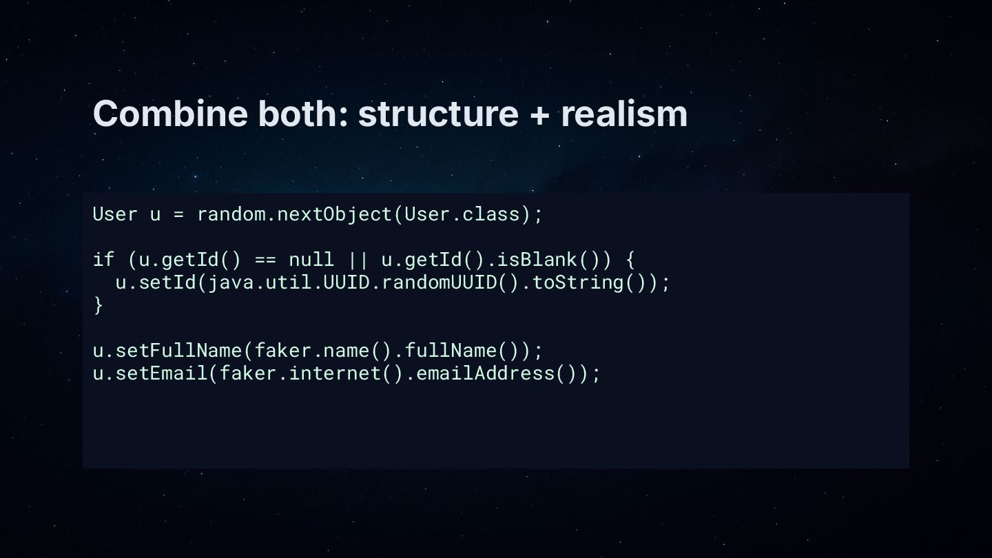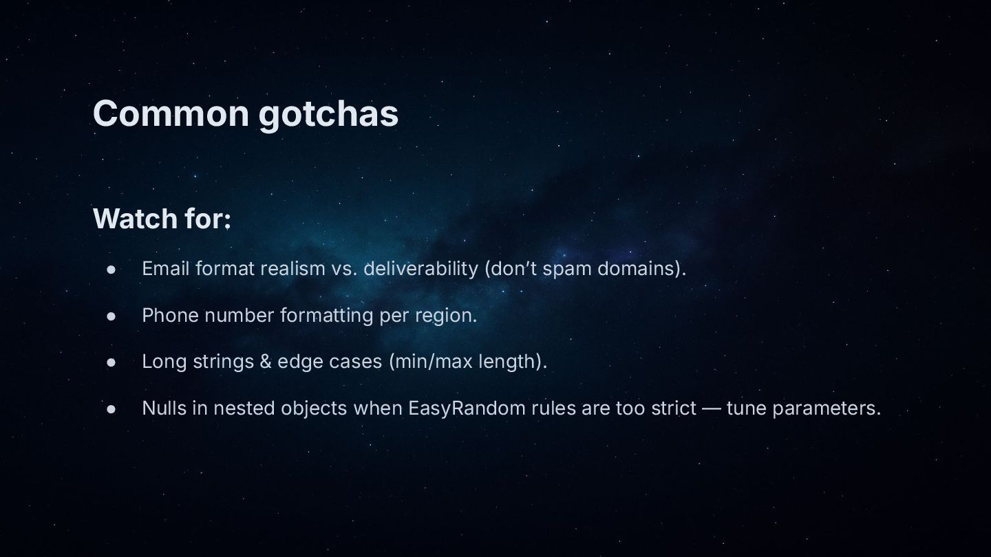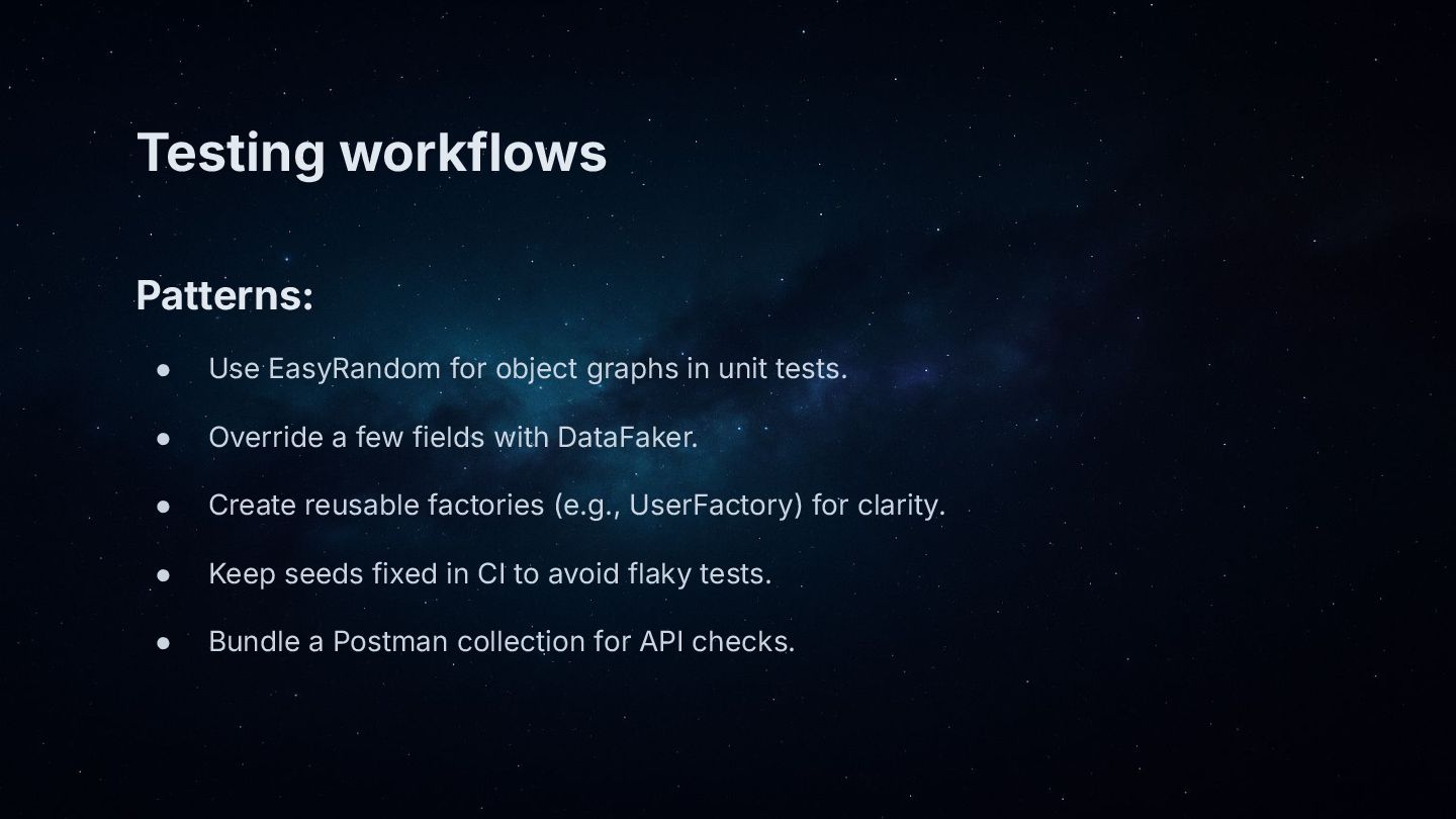 • Core patterns: generate objects with EasyRandom, then “polish” key fields (name, email, address) using DataFaker.