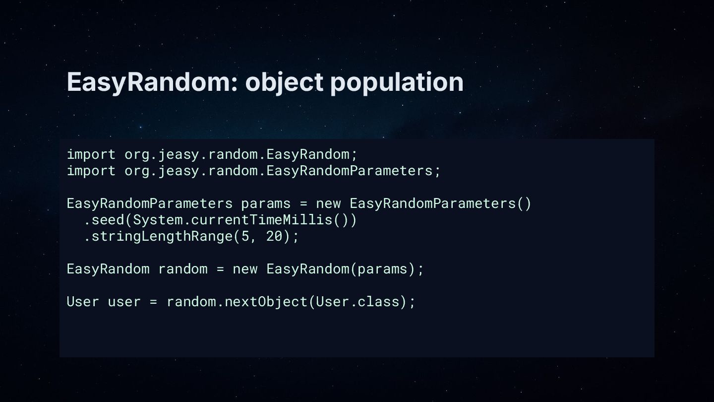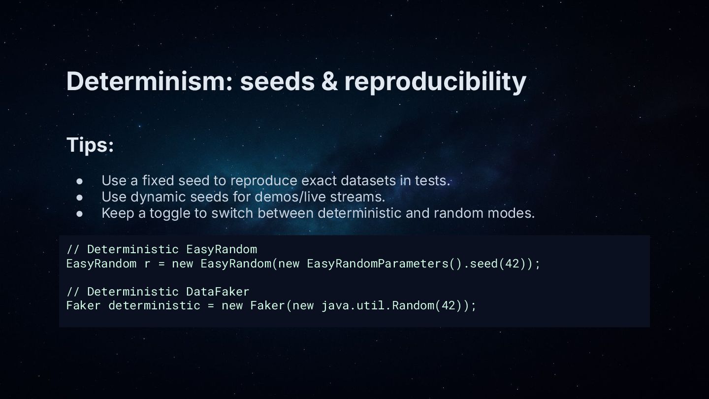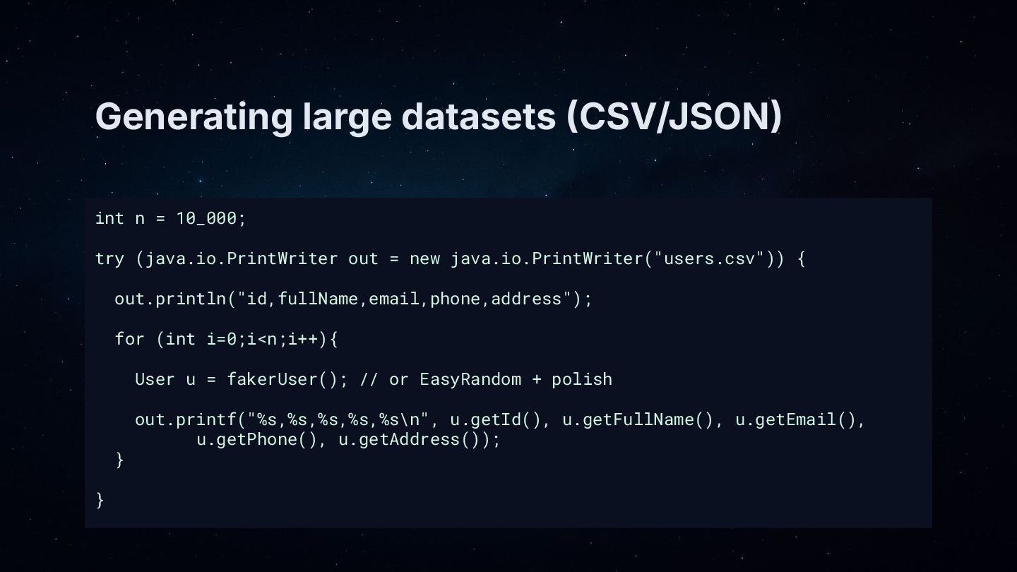 • Core patterns: generate objects with EasyRandom, then “polish” key fields (name, email, address) using DataFaker.