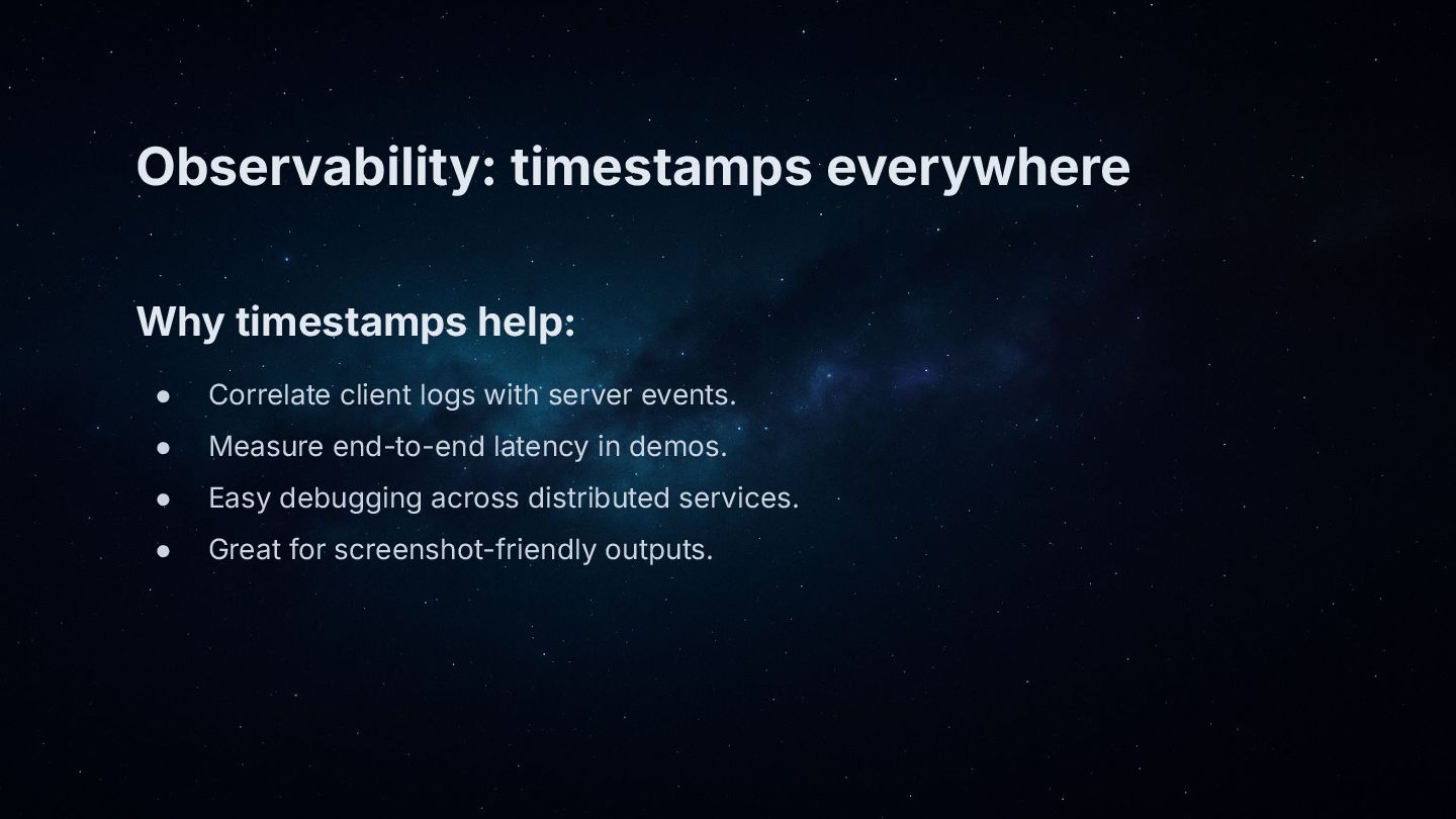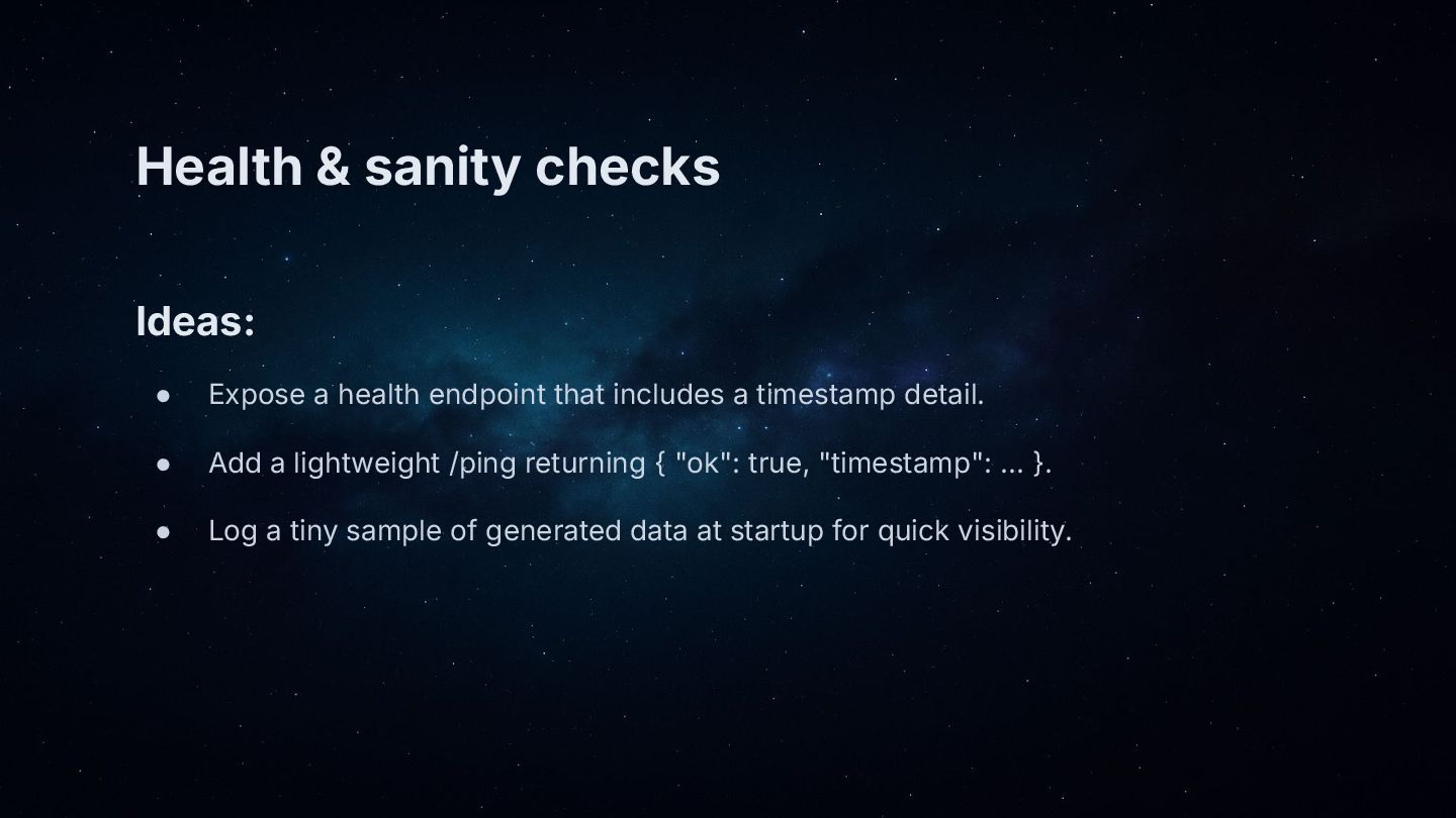 • Observability: timestamps in responses, lightweight health/ping for sanity.