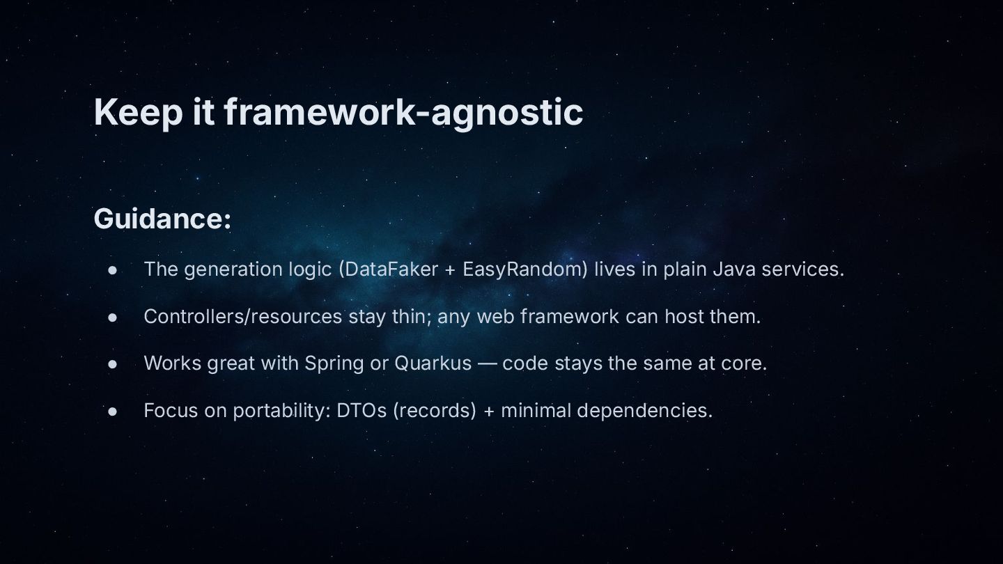 • Framework-agnostic: generation lives in plain Java; works with Quarkus or Spring—no lock-in.