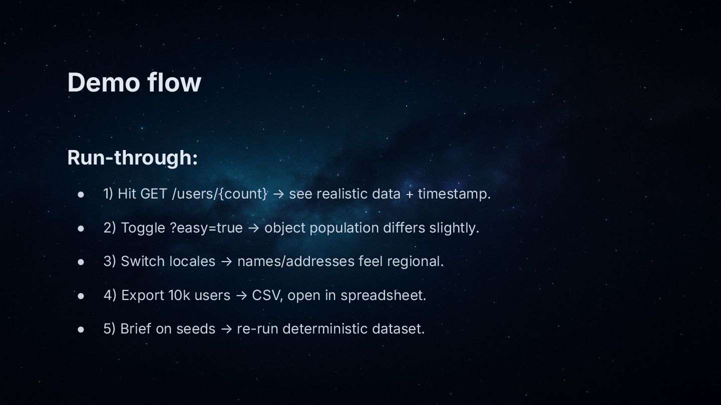 • Demo walkthrough: generate users, toggle EasyRandom/locale/seed, export 10k rows.