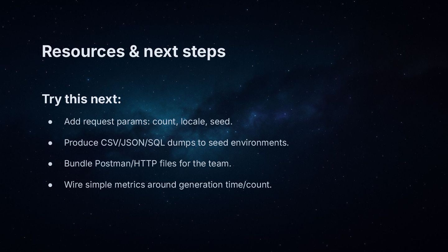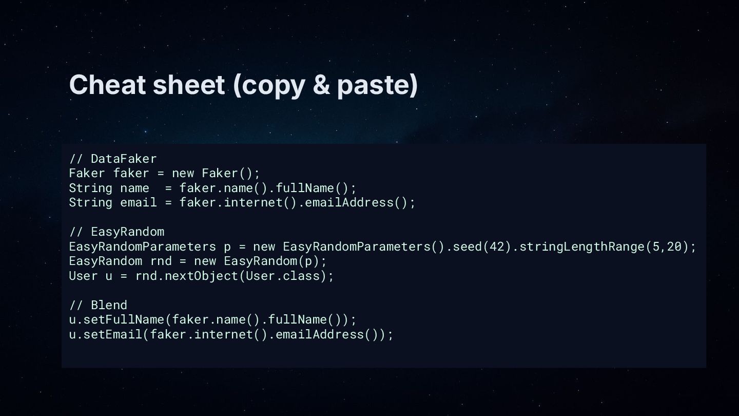 • Cheat sheet: copy-paste snippets for DataFaker, EasyRandom, and the blend pattern.