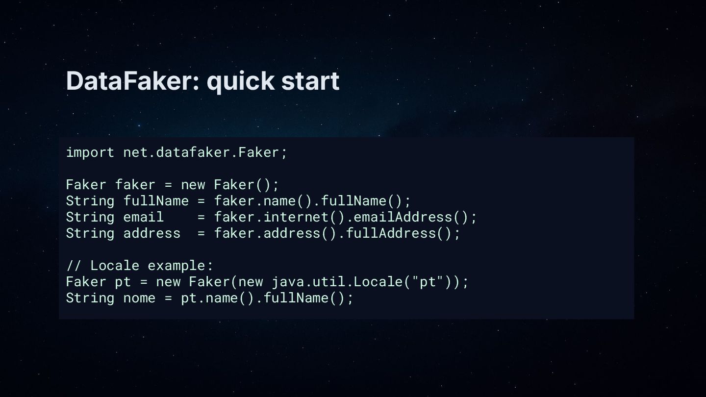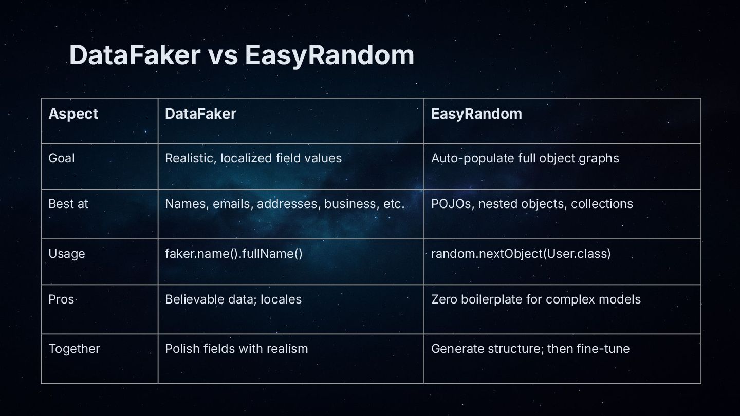 • Quick compare: DataFaker for lifelike fields; EasyRandom for full object graphs. They’re better together.