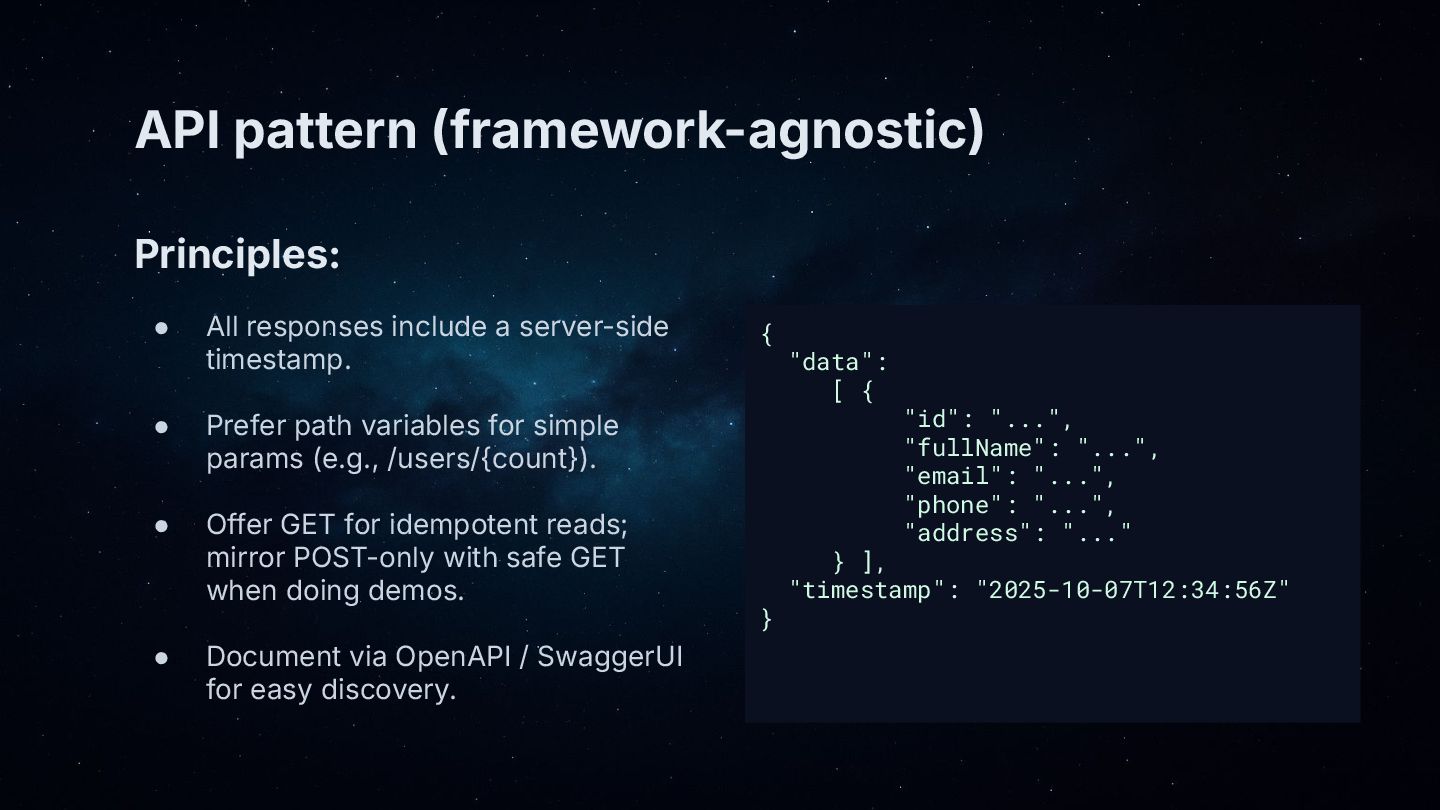 • API design: clean endpoints (e.g., /users/{count}), consistent envelope with server-side timestamp.